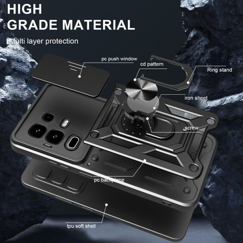 Schützen Sie Ihr Infinix Note 50s 5G mit dieser robusten Hülle mit innovativem, verschiebbarem Kameraschutz, integrierter Drehhalterung und militärischer Stoßfestigkeit. Kompatibel mit magnetischen Halterungen für Autos.
