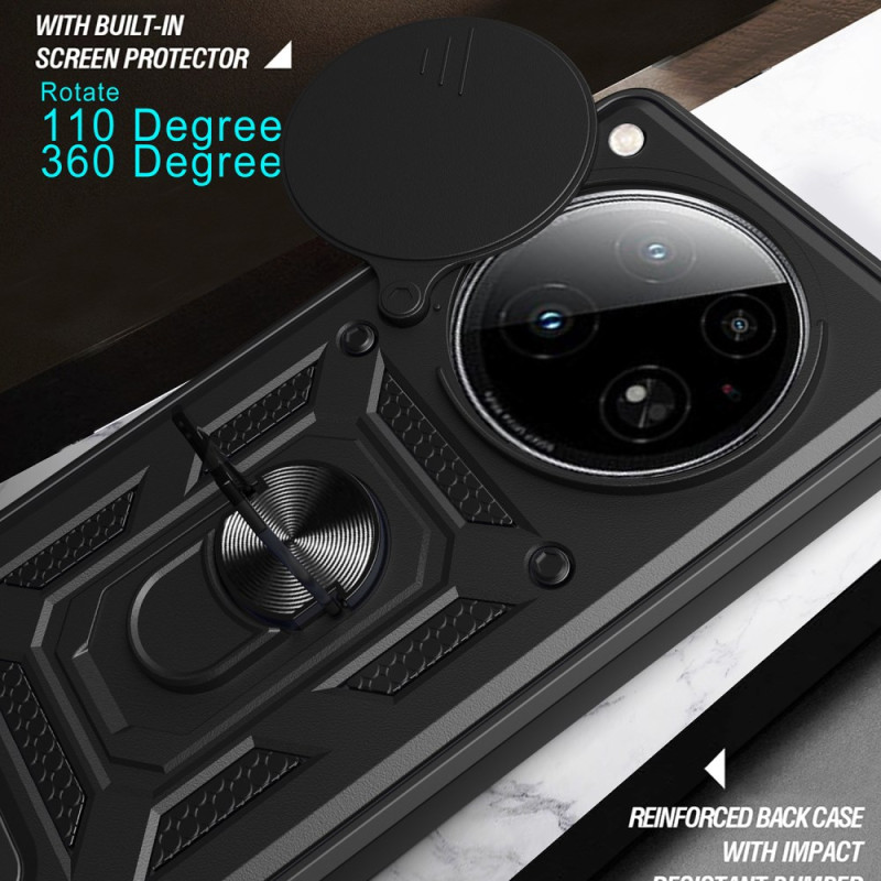 Schützen Sie Ihr Infinix Zero 40 5G mit dieser innovativen Hülle mit verschiebbarem Kameraschutz, integrierter drehbarer Halterung und verstärktem Schutz in Militärqualität. Kompatibel mit magnetischen Halterungen für Autos.