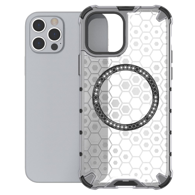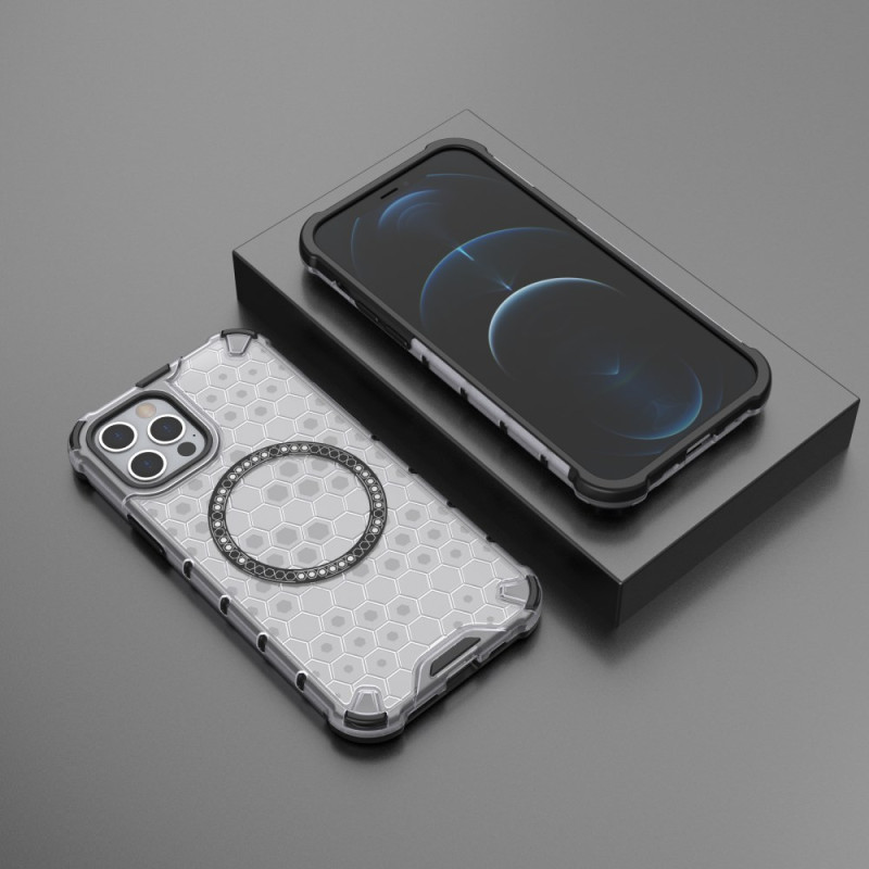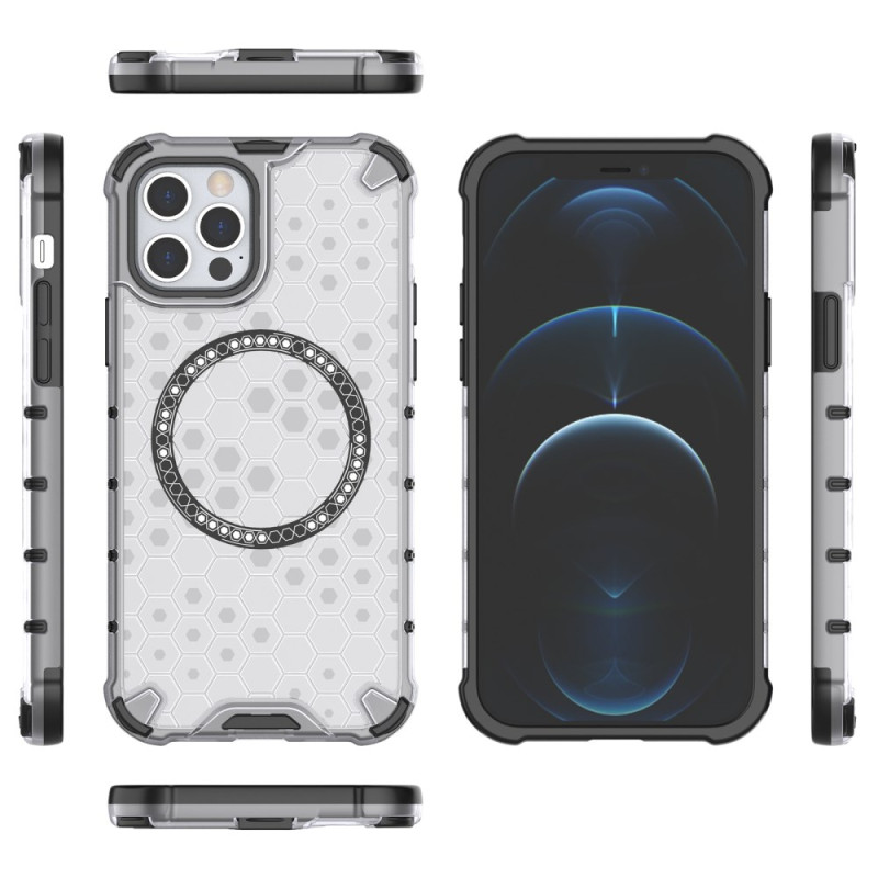 Entdecken Sie unsere innovative magnetische Hülle für das iPhone 12 / 12 Pro. Sie ist eine Kombination aus TPU und PC und bietet mit ihrem eleganten Wabendesign optimalen Schutz. Die Ecken sind verstärkt, um Stöße und Stürze zu vermeiden. Sie ist MagSafe-kompatibel und ermöglicht ein bequemes kabelloses Aufladen, während sie Ihr Telefon schützt.