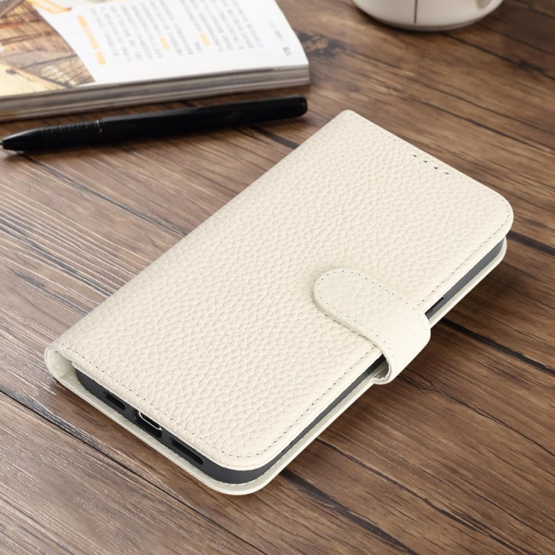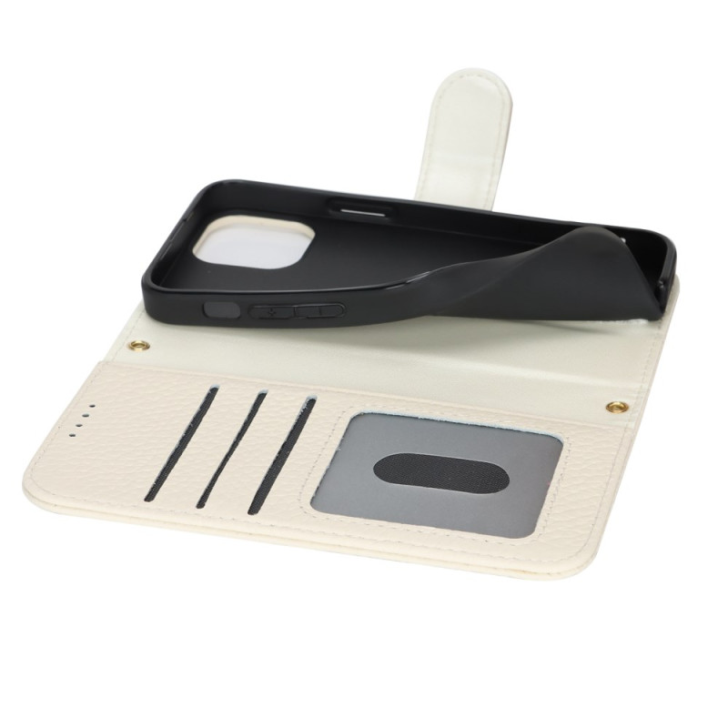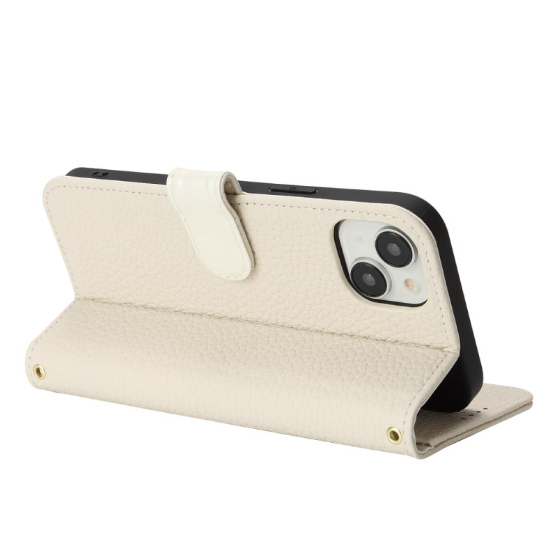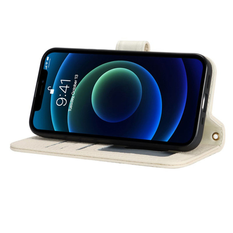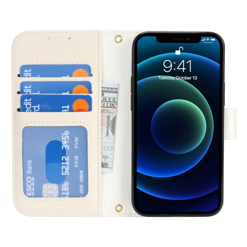 Multifunktionale Brieftasche für das iPhone 13 Mini mit integriertem Ständer und RFID-Schutz. Elegantes, strukturiertes Design mit mehreren Fächern für Karten und Bargeld. Voller Zugriff auf alle Funktionen des Telefons.