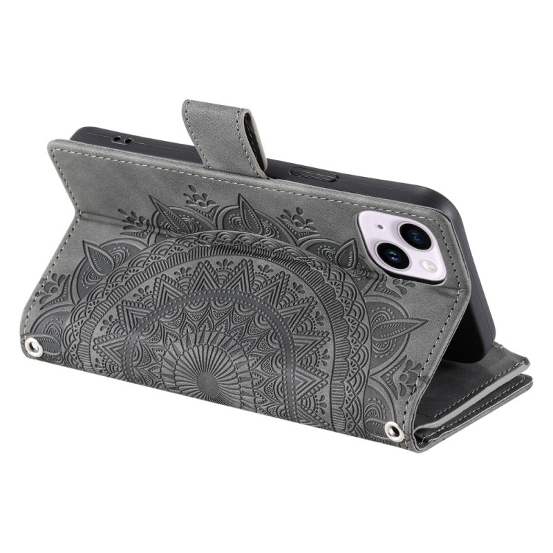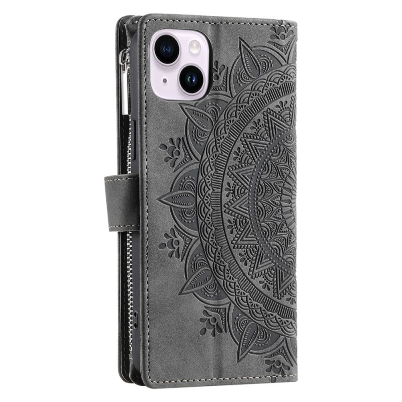 Elegante Brieftasche für das iPhone 13 Mini mit eingraviertem Mandala-Muster. Enthält mehrere Kartenfächer, ein Reißverschlussfach, einen sicheren Magnetverschluss und eine praktische Handschlaufe. Integrierte Standfunktion für freihändiges Betrachten.