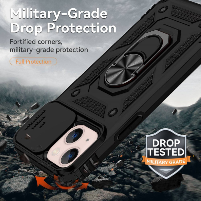 Schützen Sie Ihr iPhone 13 Mini mit dieser innovativen Hülle mit verschiebbarem Kameraschutz, einem um 360° drehbaren Stützring und einer integrierten Magnetplatte. Robustes Hybrid-Design für optimalen Schutz im Alltag.