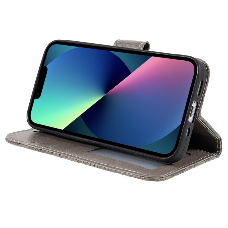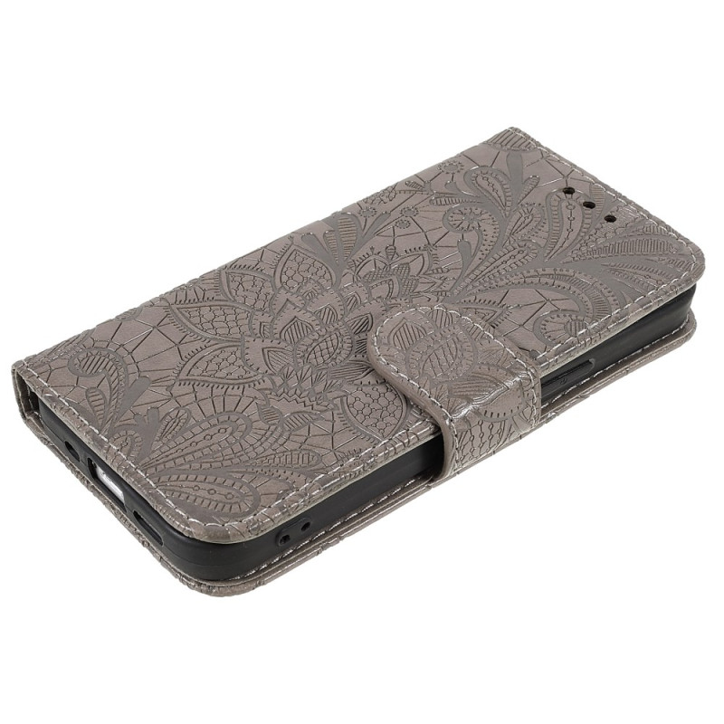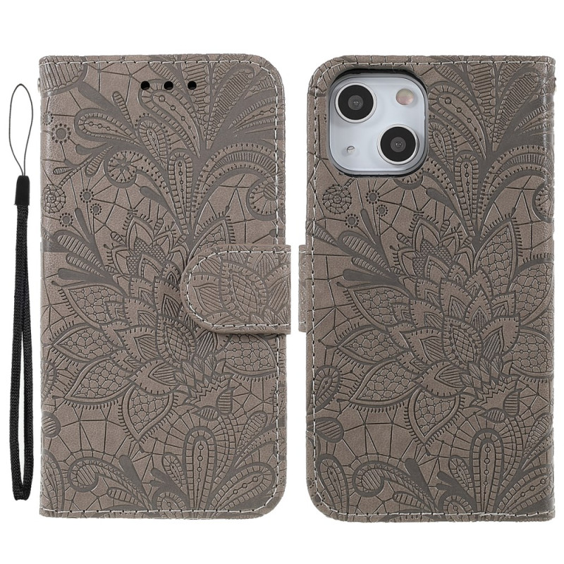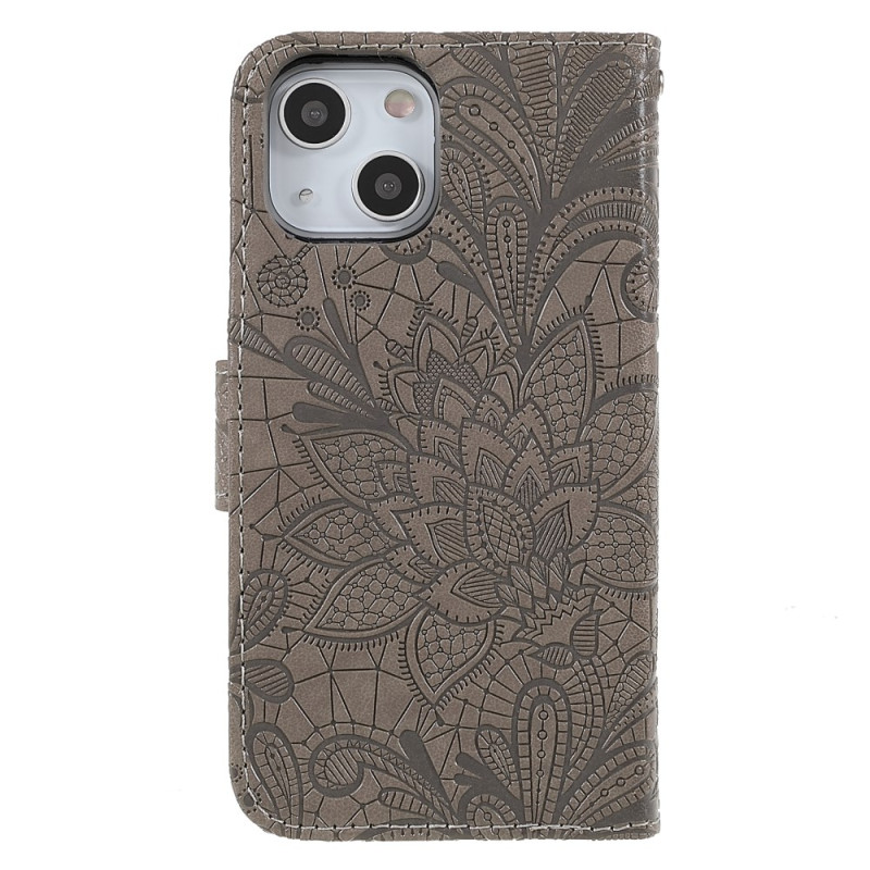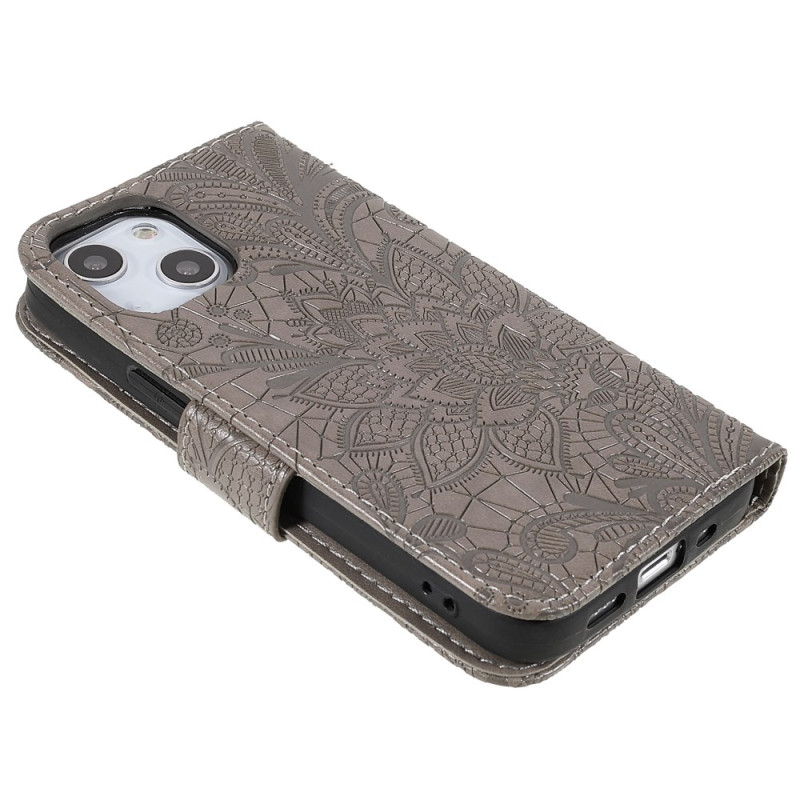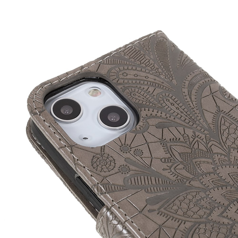 Entdecken Sie diese elegante Brieftasche mit einer Klappe, die mit einem floralen Spitzenmuster verziert ist. Mit mehreren Kartenfächern, einer praktischen Standfunktion und einer sicheren Handschlaufe vereint es edlen Stil mit optimalem Schutz für Ihr iPhone 13 mini.