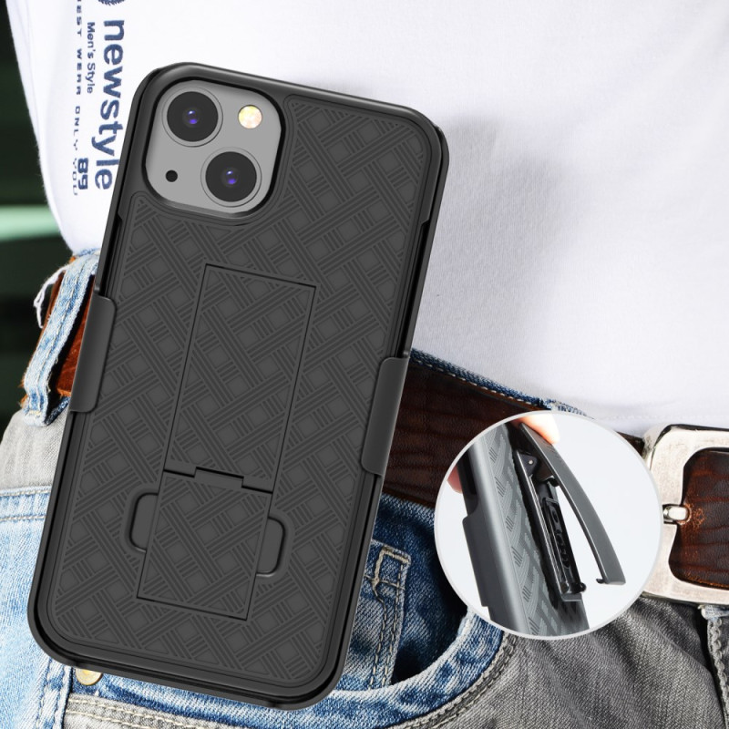 Schützen Sie Ihr iPhone 13 Mini stilvoll mit dieser stoßfesten Hülle in elegantem, strukturiertem Design. Mit einem um 180° drehbaren Gürtelclip und einem integrierten Ständer bietet sie verstärkten Schutz und praktische Alltagstauglichkeit für ein optimales Erlebnis.