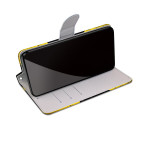 Schützen Sie Ihr iPhone 13 Mini stilvoll mit dieser eleganten Klapptasche. Das einzigartige Design mit gelb-schwarzem Panel-Muster verleiht Ihrem Smartphone einen gewagten Touch. Mit integrierter Halterung für freihändiges Betrachten und Rundumschutz.