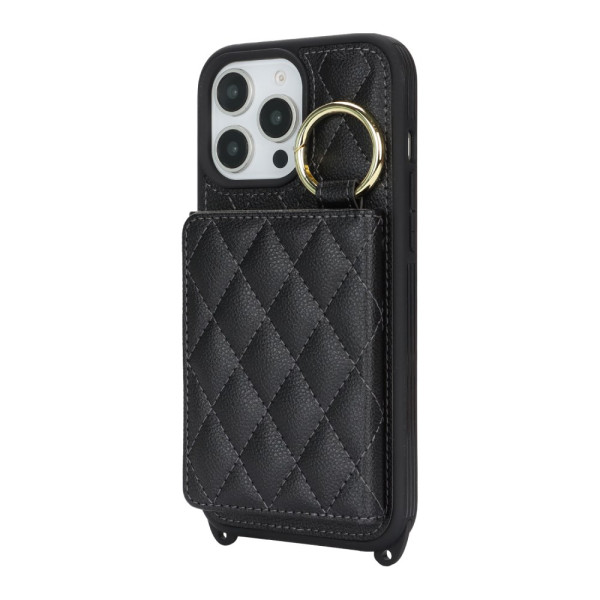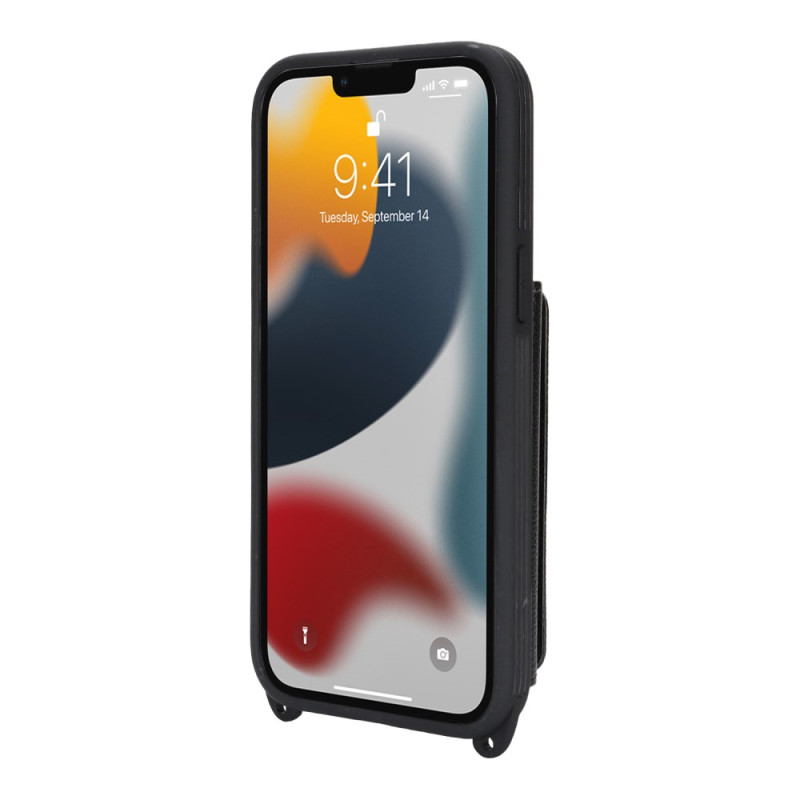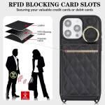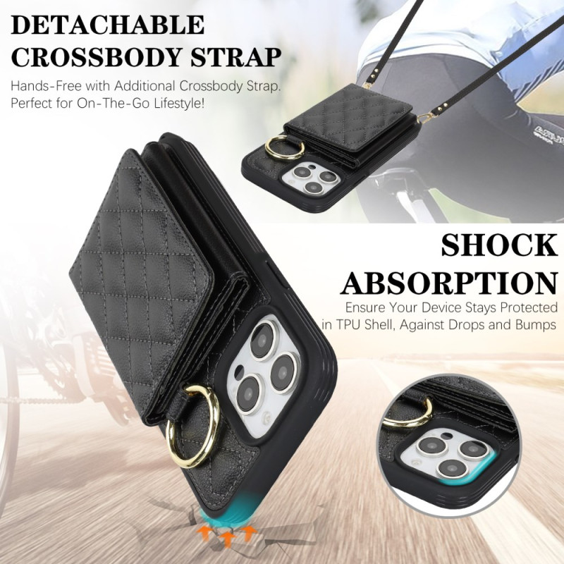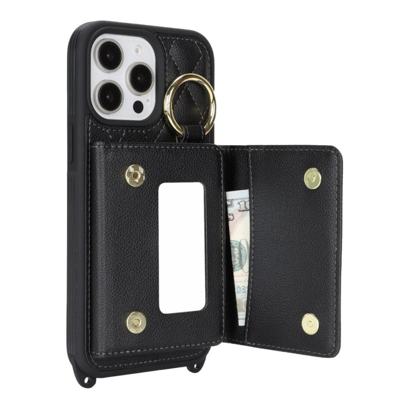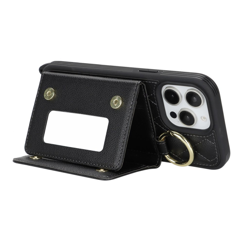 Multifunktionale Hülle mit verstellbarem Kabel, 3 Kartenfächern, integriertem Spiegel und RFID-Schutz. Elegantes Design mit Karomuster und klappbarem Ständer für optimale freihändige Nutzung.