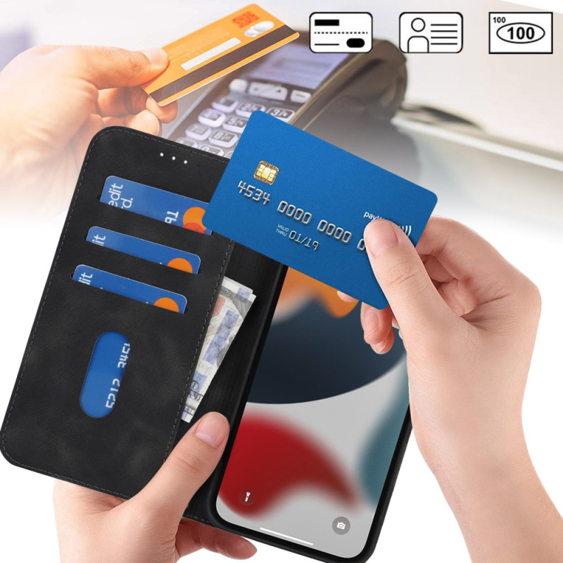 • Integrierte Brieftasche mit drei Kartenfächern und einer Seitentasche, in der Sie Ihre Bankkarten, Ihren Ausweis und Bargeld einfach transportieren können