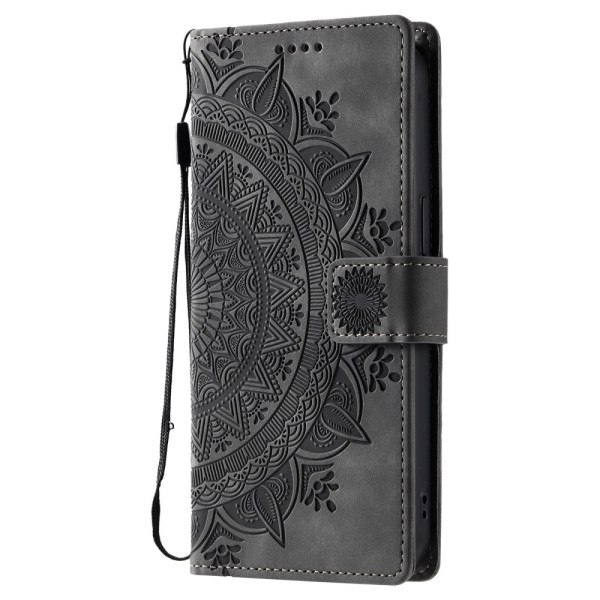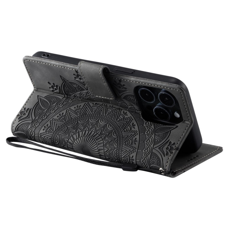 Elegante Brieftasche aus PU-Leder mit aufgedrucktem Mandala-Motiv für das iPhone 13 Pro Max. Enthält 3 Kartenfächer, ein Bargeldfach, einen Magnetverschluss und eine praktische Handschlaufe. Umfassender Schutz und integrierte Ständerfunktion.