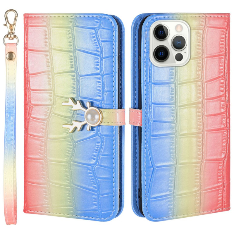 Schützen Sie Ihr iPhone 13 Pro Max stilvoll mit dieser Premium-Ledertasche. Sie verfügt über eine raffinierte Krokodil-Muster mit Farbverlauf und vereint mit ihren Kartenfächern, der verstellbaren Halterung und der praktischen Handschlaufe Stil und Funktionalität.