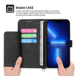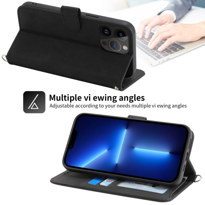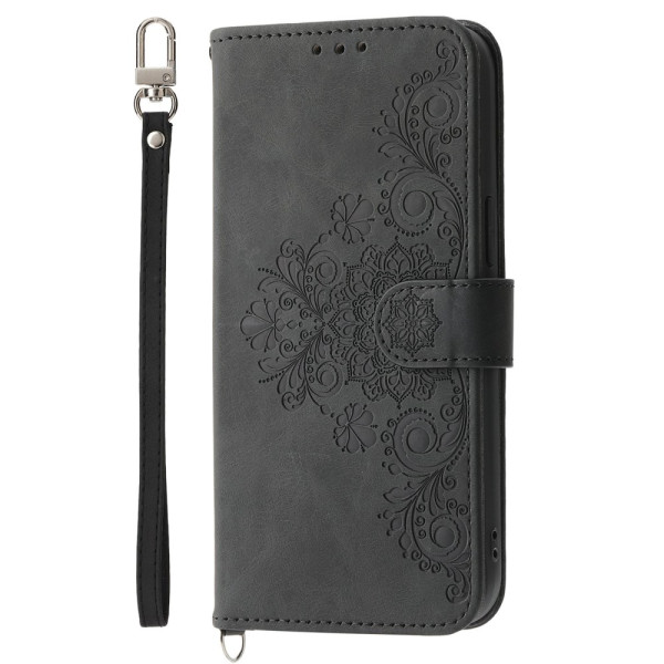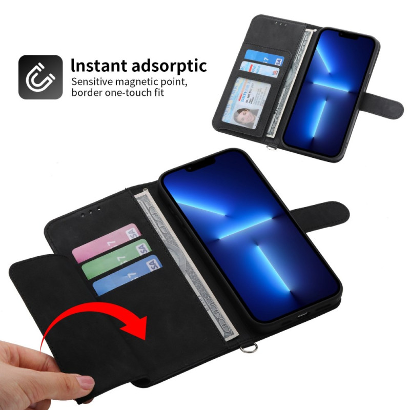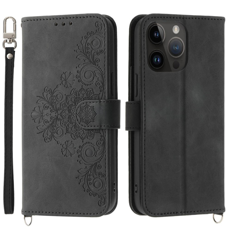 Entdecken Sie diese elegante Brieftasche für das iPhone 13 Pro Max 6,7 Zoll. Raffiniertes Design mit aufgedrucktem Blumenmuster, integrierter Standfunktion und praktischen Fächern für Karten und Geldscheine. Inklusive Schultergurt und Handschlaufe.