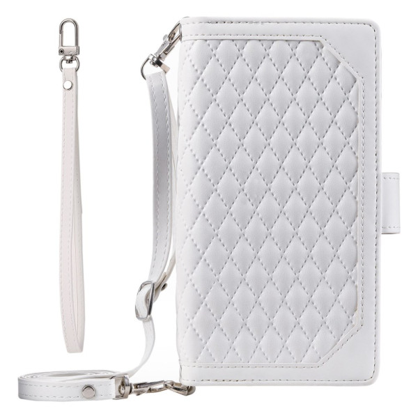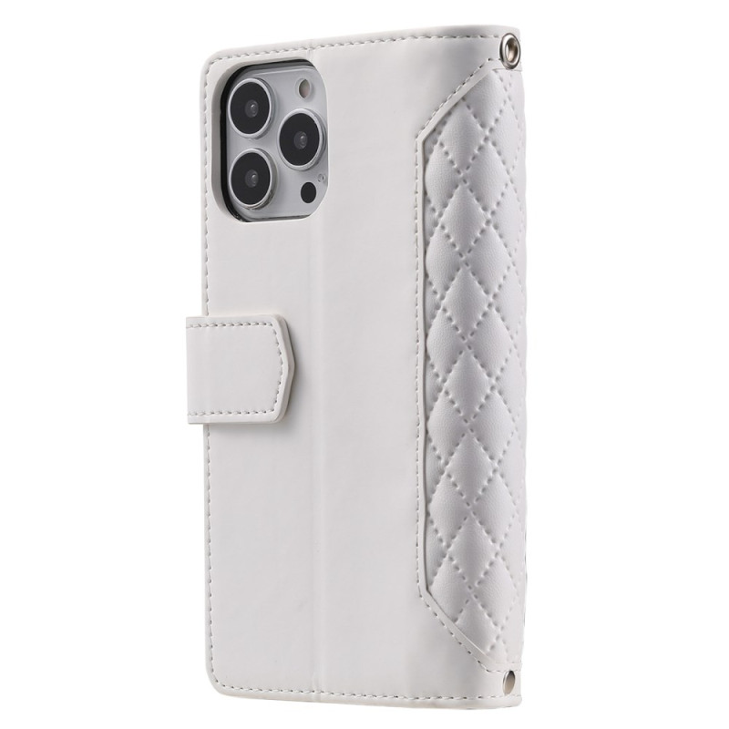 Entdecken Sie diese elegante Brieftasche für das iPhone 13 Pro Max. Es besteht aus rautenförmigem, strukturiertem PU-Leder mit einer flexiblen TPU-Hülle und bietet einen umfassenden Schutz vor Stößen. Ausgestattet mit mehreren Kartenfächern, einem Reißverschlussfach und einem ausklappbaren Ständer für freihändiges Betrachten.