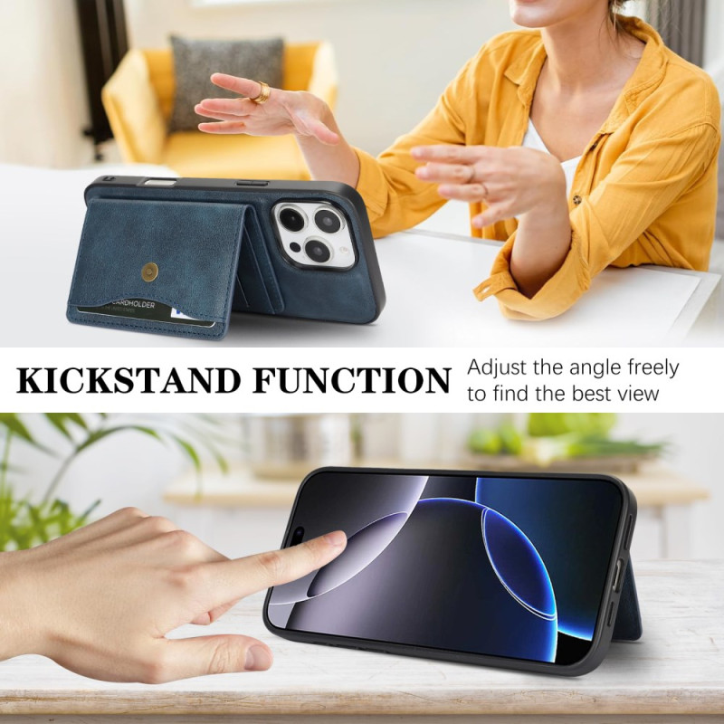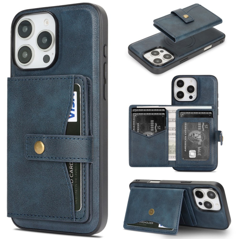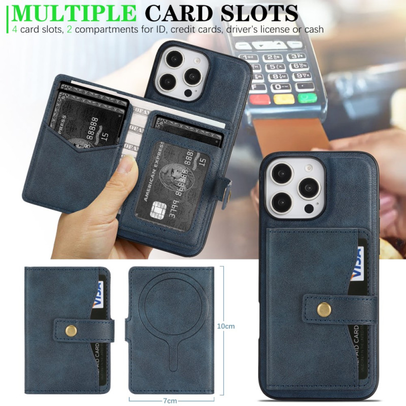 Multifunktionale Schutzhülle für das iPhone 13 Pro, die Schutz, Zweckmäßigkeit und Eleganz vereint. MagSafe-kompatibel mit abnehmbarem magnetischem Kartenhalter und integrierter verstellbarer Halterung. Perfekt für die Aufbewahrung Ihrer Karten und zum freihändigen Betrachten.