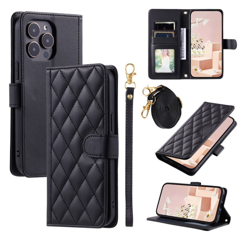 Étui portefeuille élégant en cuir avec motif matelassé pour iPhone 13 Pro. Comprend une bandoulière ajustable, une dragonne, 3 emplacements pour cartes et une poche pour pièces. Fonction support intégrée pour un visionnage mains libres...