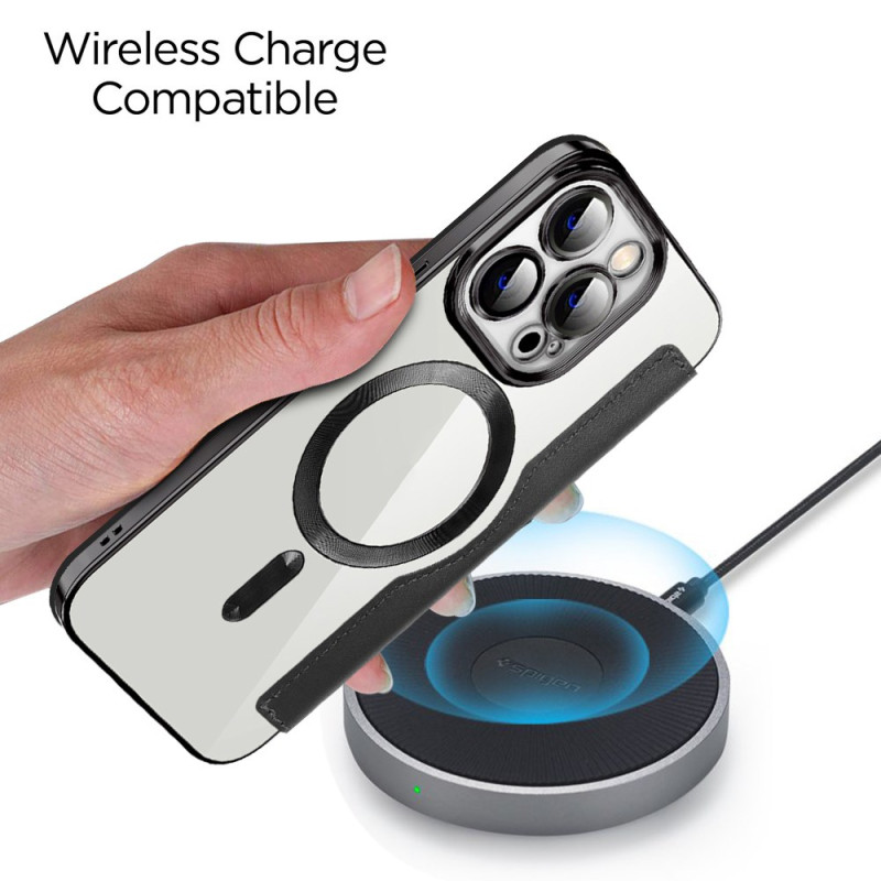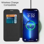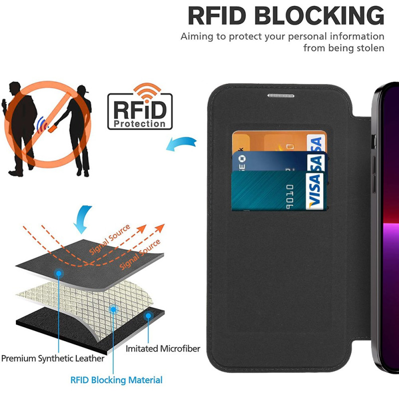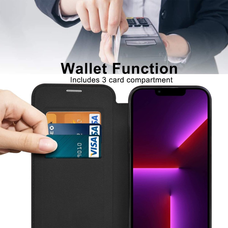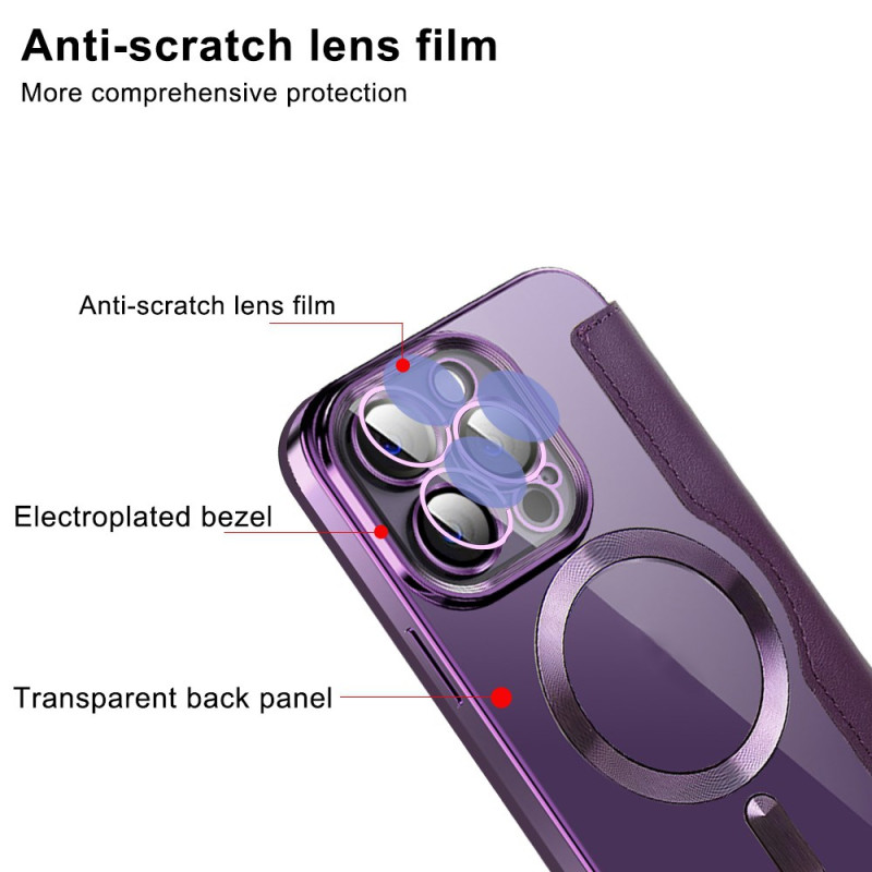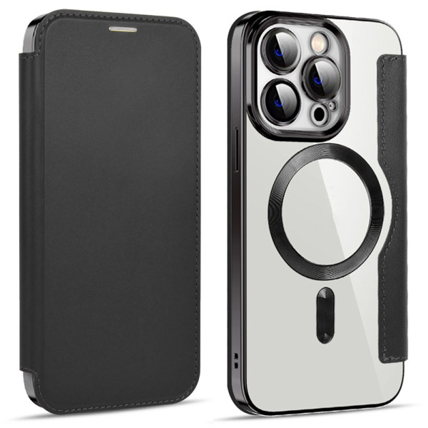 Coque élégante en cuir PU et TPU pour iPhone 13 Pro, compatible MagSafe avec aimants intégrés. Protection RFID, fentes pour cartes, dos transparent et film protecteur pour objectif. Charge sans fil optimisée et sécurité renforcée.