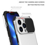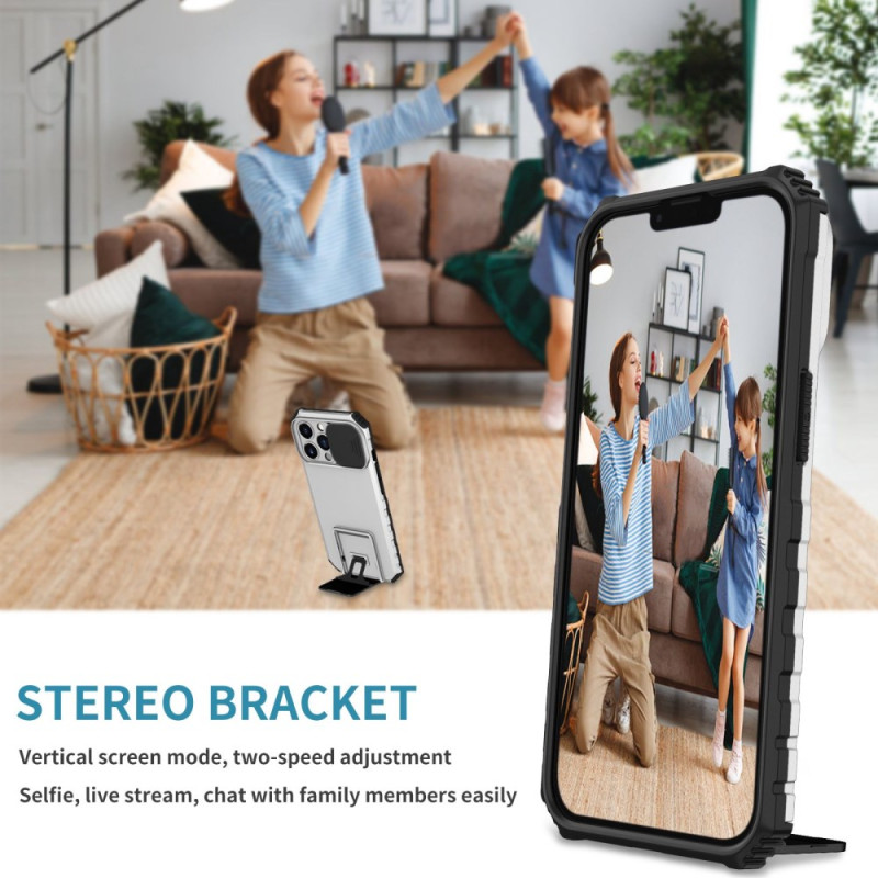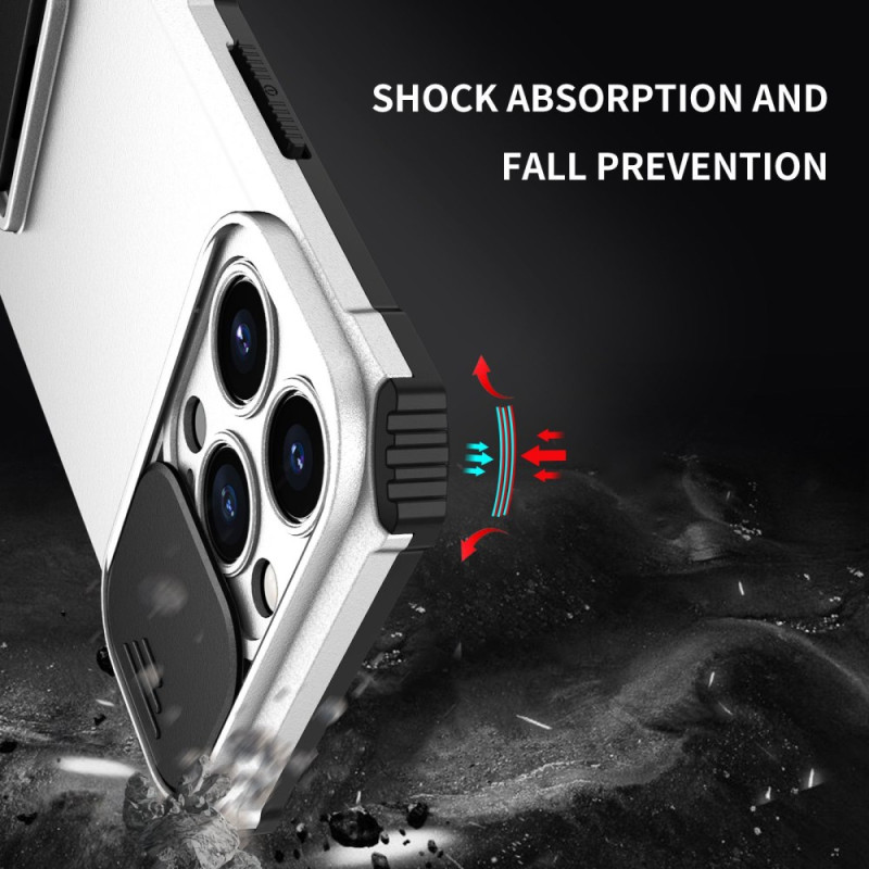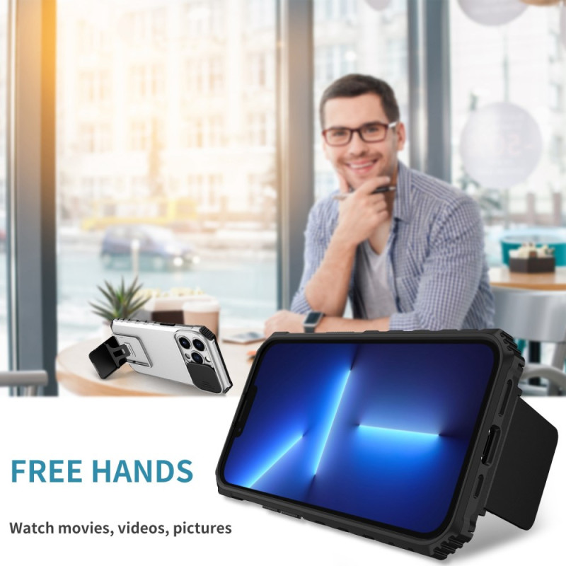Schützen Sie Ihr iPhone 13 Pro mit dieser innovativen Hülle mit verschiebbarer Kameraabdeckung und verstellbarer vertikaler Halterung. Das Design aus zwei Materialien vereint Flexibilität und Steifigkeit und bietet so optimalen Schutz vor Stößen, Kratzern und Staub.