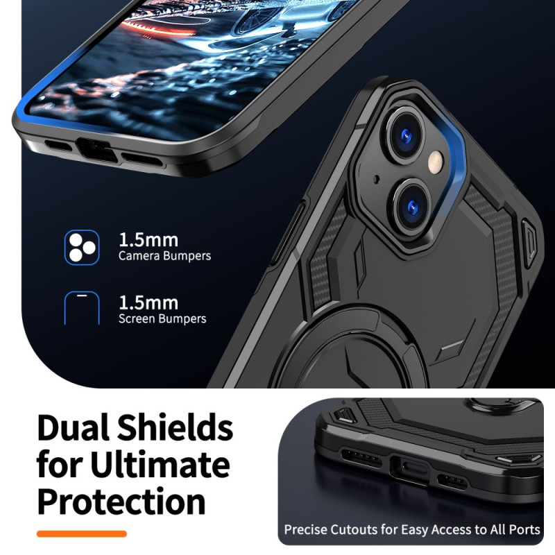 Entdecken Sie unsere Hybridhülle aus PC und TPU für das iPhone 13. Mit einem magnetischen Ring, der als Ständer dient, bietet sie einen robusten Schutz gegen Stöße und Stürze. Das ergonomische Design sorgt für einen angenehmen Griff, während die präzisen Schnitte einen einfachen Zugriff auf alle Tasten und Anschlüsse ermöglichen.