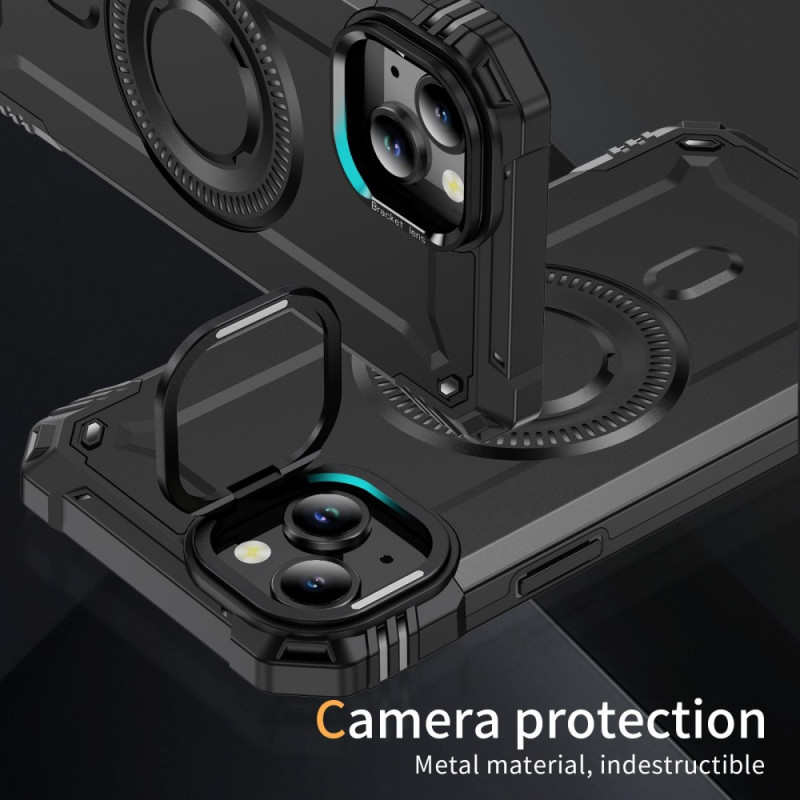 Entdecken Sie unsere innovative Hülle für das iPhone 13, die für optimalen Schutz und erhöhte Funktionalität entwickelt wurde. Mit einer verstellbaren Metallhalterung, die in den Kamerarahmen integriert ist, bietet sie eine praktische freihändige Ansicht. Mit starken N52-Magneten verbessert sie das kabellose Laden und unterstützt magnetische Autohalterungen.