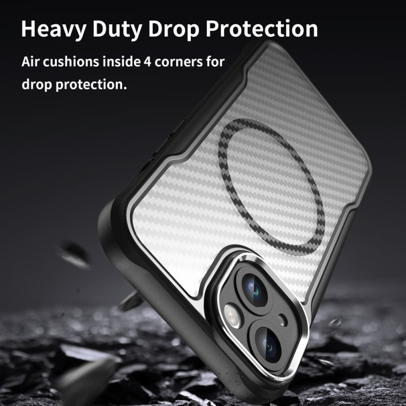 Entdecken Sie unsere innovative magnetische Hülle für das iPhone 13. Sie vereint Haltbarkeit und Stil und bietet dank ihrer Konstruktion aus PC und TPU einen robusten Schutz. Sie ist mit dem MagSafe-Ladegerät kompatibel und ermöglicht ein schnelles und müheloses Aufladen. Das elegante Design mit Karbonfasertextur ist resistent gegen Fingerabdrücke, während das präzise Design die Kamera schützt und den Zugriff auf alle Anschlüsse und Tasten erleichtert.