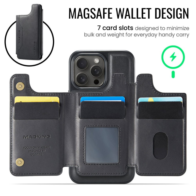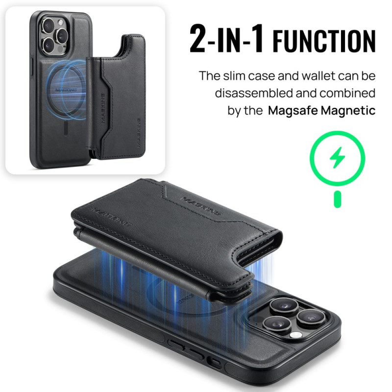 Entdecken Sie die MAGKING-Hülle für das iPhone 14 Pro Max, die Haltbarkeit und Funktionalität vereint. Hergestellt aus PC, TPU und PU, bietet sie eine hervorragende Stoßdämpfung und langfristige Haltbarkeit. Ihre verstellbare Halterung ermöglicht einen einfachen Wechsel in den Lese- oder Filmmodus mit einem maximalen Winkel von 135°. Das integrierte magnetische Design sorgt für die Kompatibilität mit dem kabellosen MagSafe-Ladegerät. Dank des 2-in-1-Designs lassen sich die dünne Hülle und die Brieftasche dank der MagSafe-kompatiblen Magnetverbindung leicht voneinander trennen und kombinieren. Die Brieftasche verfügt über ein RFID-Sperrmaterial, um Ihre privaten Informationen vor unbefugten Scans zu schützen. Mit 7 Kartenfächern und einer Seitentasche bietet sie vielseitigen Stauraum für Ihre Essentials.