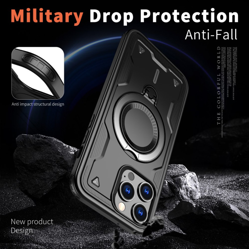 Schützen Sie Ihr iPhone 14 Pro Max mit dieser robusten Militärhülle aus PC+TPU, die mit MagSafe kompatibel ist. Mit einer um 360° drehbaren Halterung bietet sie umfassenden Schutz vor Stößen und Stürzen und ermöglicht gleichzeitig ein optimales Freisprech-Erlebnis.