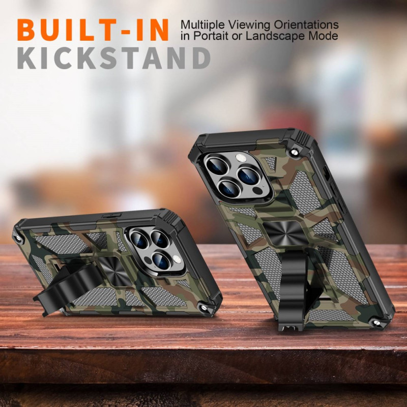Entdecken Sie diese Camouflage-Hülle, die mit einem abnehmbaren Ständer kommt, um Ihr iPhone 14 Pro Max zu sichern.