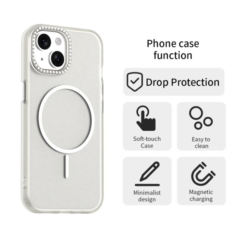 Entdecken Sie unsere elegante und schützende Hülle für das iPhone 15 Plus / 14 Plus. Sie ist mit MagSafe kompatibel und bietet zuverlässigen Schutz vor der täglichen Abnutzung und kleineren Stürzen. Der mit Strasssteinen verzierte Linsenrahmen sorgt für einen Hauch von Glamour, während das präzise Design den vollen Zugriff auf alle Funktionen Ihres Telefons gewährleistet.