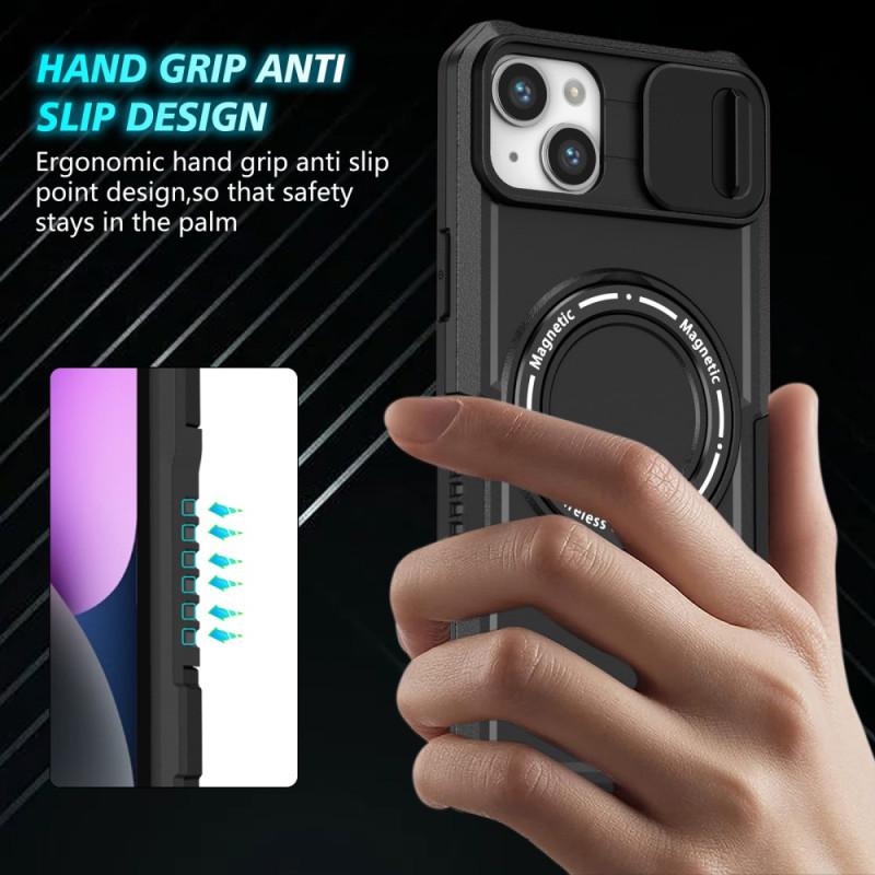 Entdecken Sie unsere innovative Schutzhülle für das iPhone 15 Plus. Mit einem praktischen Ständer, einem verschiebbaren Objektivschutz und MagSafe-kompatibel bietet sie militärischen Schutz vor Stößen und ermöglicht gleichzeitig das kabellose Aufladen. Ideal zum Anschauen von Videos und für eine einfache Handhabung.