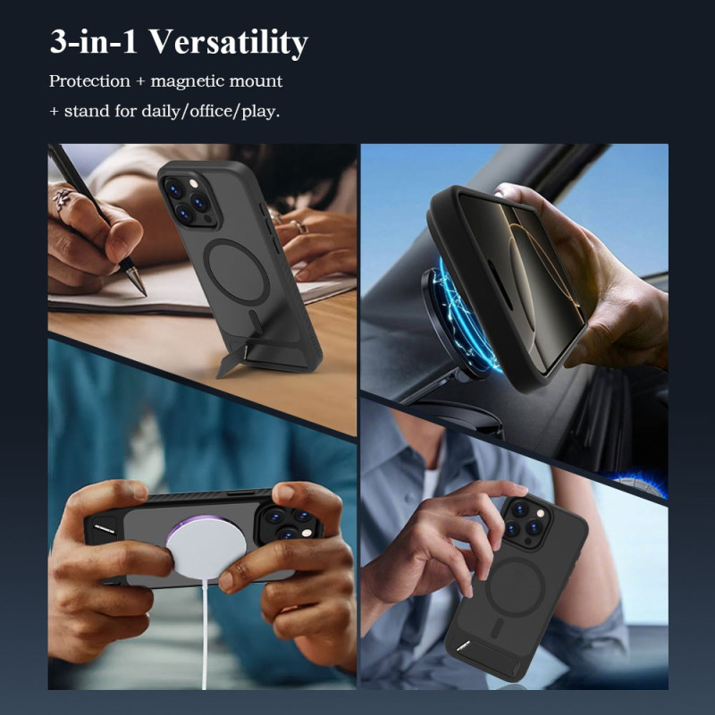 Entdecken Sie unsere innovative Schutzhülle für das iPhone 15 Pro Max. Die Hülle ist langlebig und funktional und bietet optimalen Schutz vor Stößen und Kratzern. Die Hülle ist mit MagSafe kompatibel und verfügt über eine verstellbare Halterung für freihändiges Betrachten. Das ergonomische Design sorgt für einen bequemen und sicheren Griff.