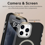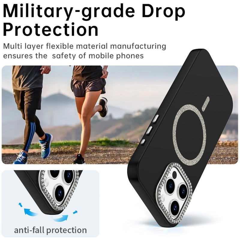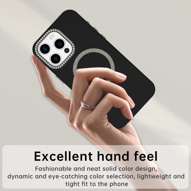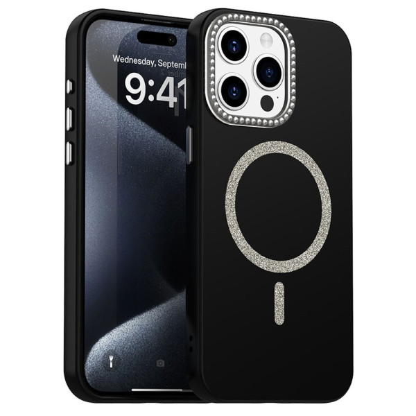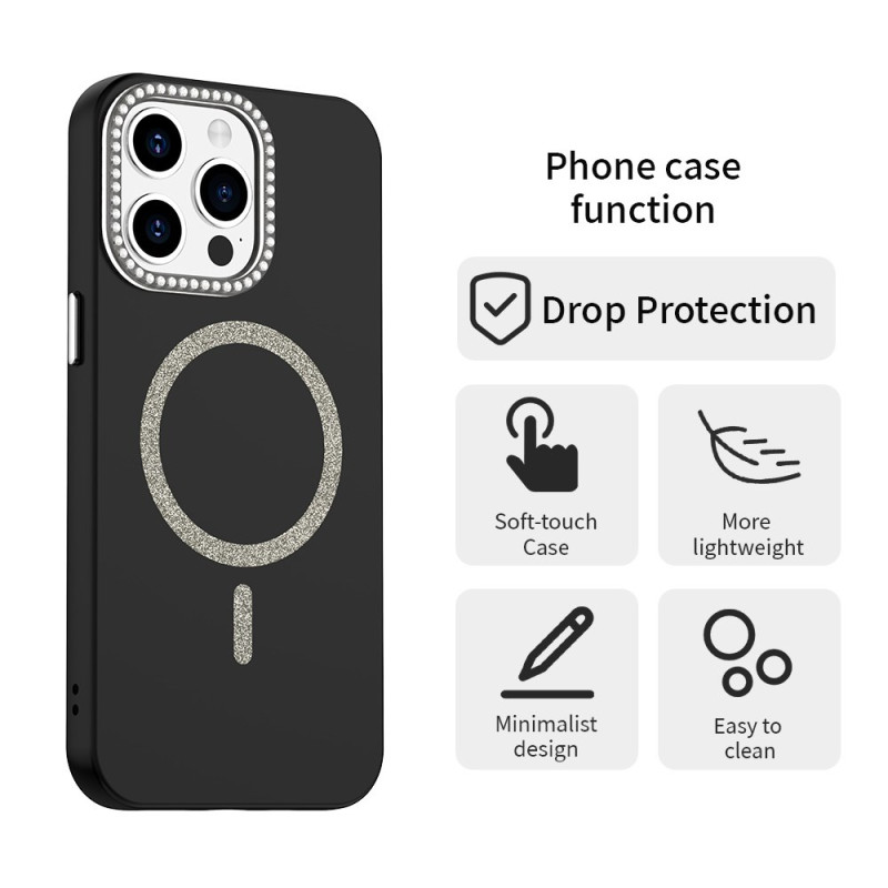 Entdecken Sie unsere elegante Hülle für das iPhone 15 Pro, die Stil und Schutz vereint. Sie ist MagSafe-kompatibel und ermöglicht ein effizientes kabelloses Aufladen. Der mit Strasssteinen verzierte Linsenrahmen verleiht ihr einen luxuriösen Touch, während das Glitzerfinish für Glamour sorgt. Hergestellt aus hochwertigem TPU und PET, bietet sie dauerhaften Schutz vor Kratzern und Stößen.