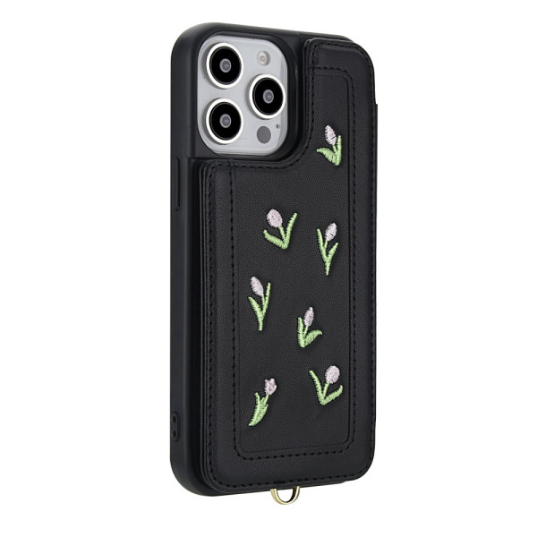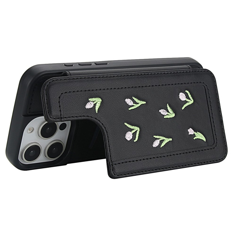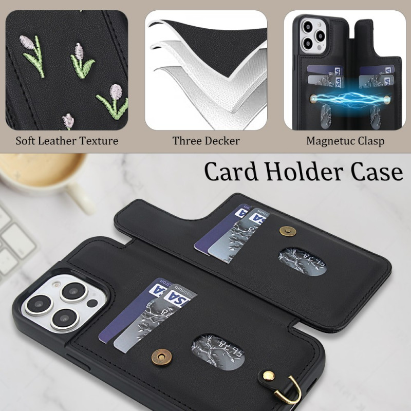 Entdecken Sie unsere elegante Hülle für das iPhone 15 Pro mit Tulpenstickerei. Sie ist aus weichem PU-Leder gefertigt und bietet einen praktischen Kartenhalter, eine Standfunktion und umfassenden Schutz. Der verstellbare Schultergurt und die Handschlaufe sorgen dafür, dass Sie die Hülle vielseitig tragen können.