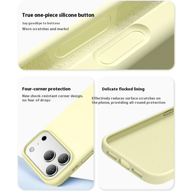 Mit dieser Hülle aus Flüssigsilikon für das iPhone 17 Pro Max erreicht der Benutzerkomfort eine neue Dimension. Das Design kombiniert einen stabilen PC-Rahmen mit einem weichen Innenfutter aus Mikrofaser, wodurch Kratzer vermieden werden und das Smartphone makellos bleibt. Die Hülle fühlt sich dank ihres seidigen Finishs angenehm an, bleibt dünn und leicht und bietet gleichzeitig einen verstärkten Schutz. Die erhöhten Ränder um den Bildschirm und die Kamera schützen empfindliche Bereiche, während die großen Schnitte einen reibungslosen Zugang zu den Tasten und Anschlüssen gewährleisten.