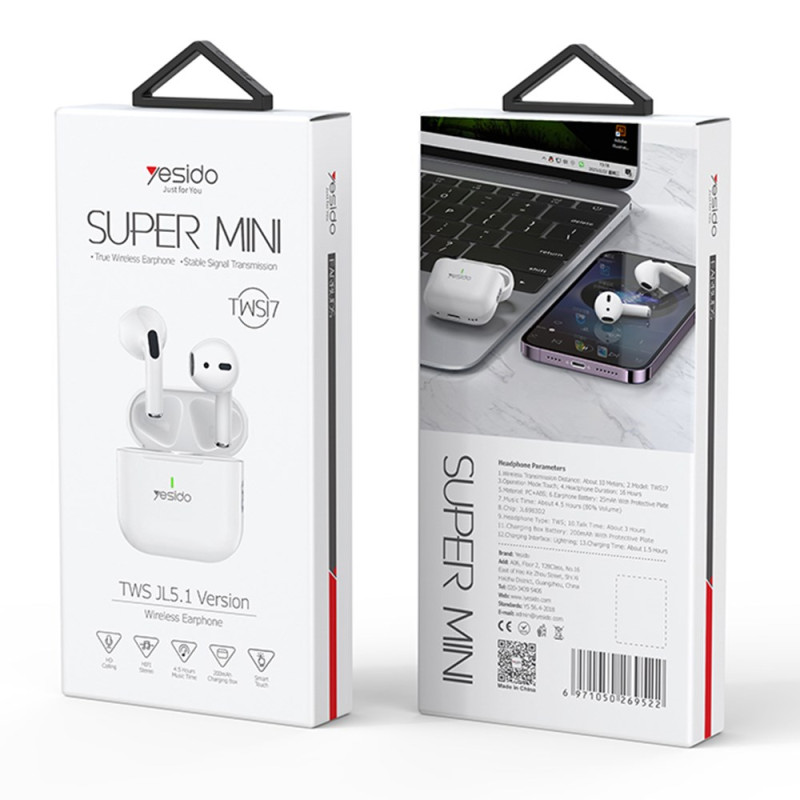 Die YESIDO TWS17 Mini-Ohrhörer bieten eine stabile Verbindung bis zu zehn Meter in freier Umgebung und sorgen so für eine reibungslose Nutzung unterwegs. Die 13-mm-Treiber und die Impedanz von 32 Ω sorgen für einen satten und klaren Klang für ein angenehmes Hörerlebnis. Die Akkulaufzeit beträgt ca. 4,5 Stunden und kumuliert sich mit der Ladebox auf bis zu sechzehn Stunden. Die Kopfhörer sind in 1,5 Stunden und die Ladebox in zwei Stunden aufgeladen. Der Bluetooth 5.1-Chip JL6983 sorgt für eine effiziente Übertragung bei geringem Energieverbrauch.