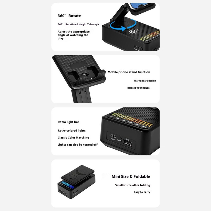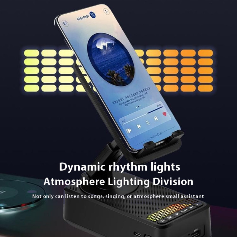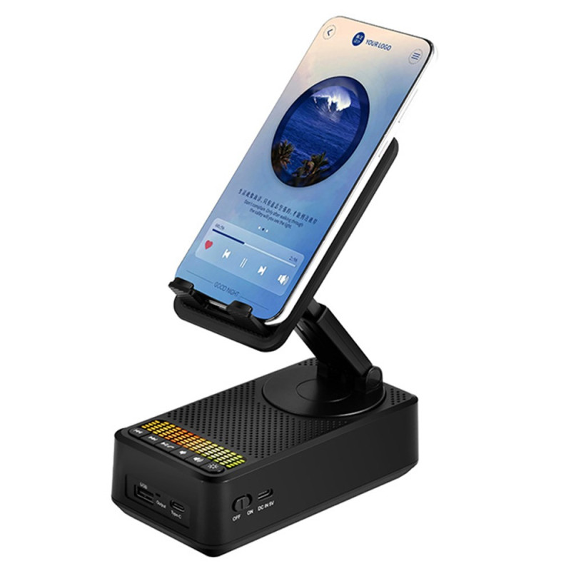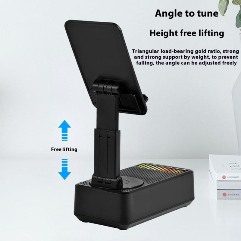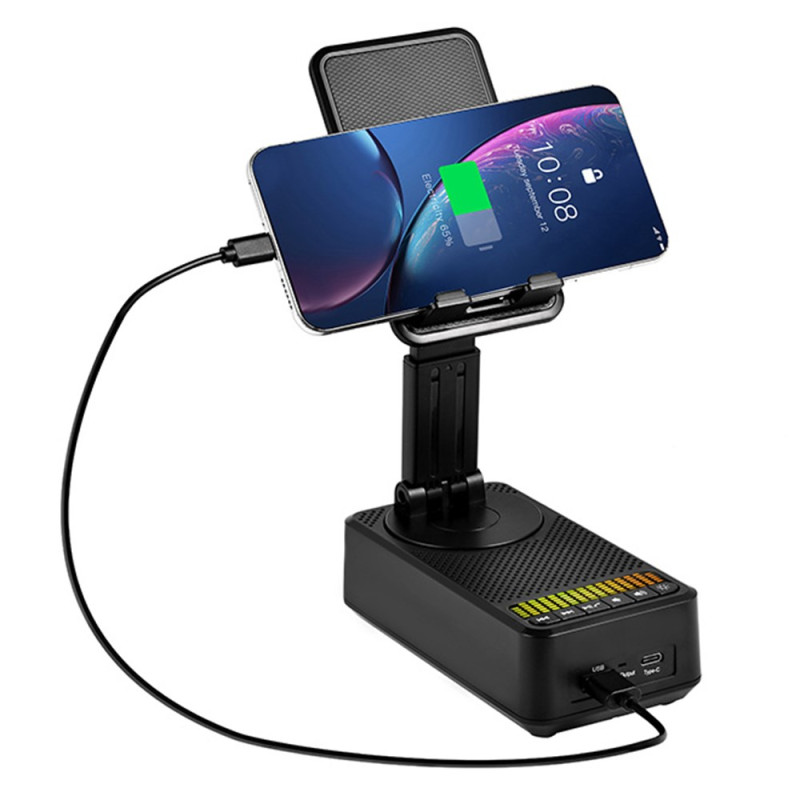 Entdecken Sie die 3-in-1-Halterung: eine um 360° verstellbare Halterung für Smartphones und Tablets, einen leistungsstarken 5W-Bluetooth-Lautsprecher und einen externen 1500mAh-Akku. Ultrakompaktes, faltbares Design mit integriertem Stimmungslicht - perfekt für zu Hause, im Büro oder unterwegs.