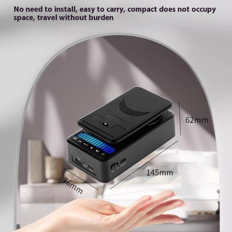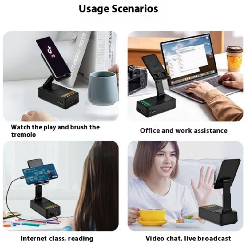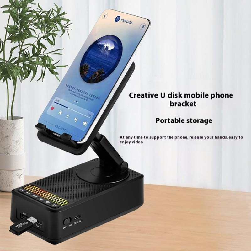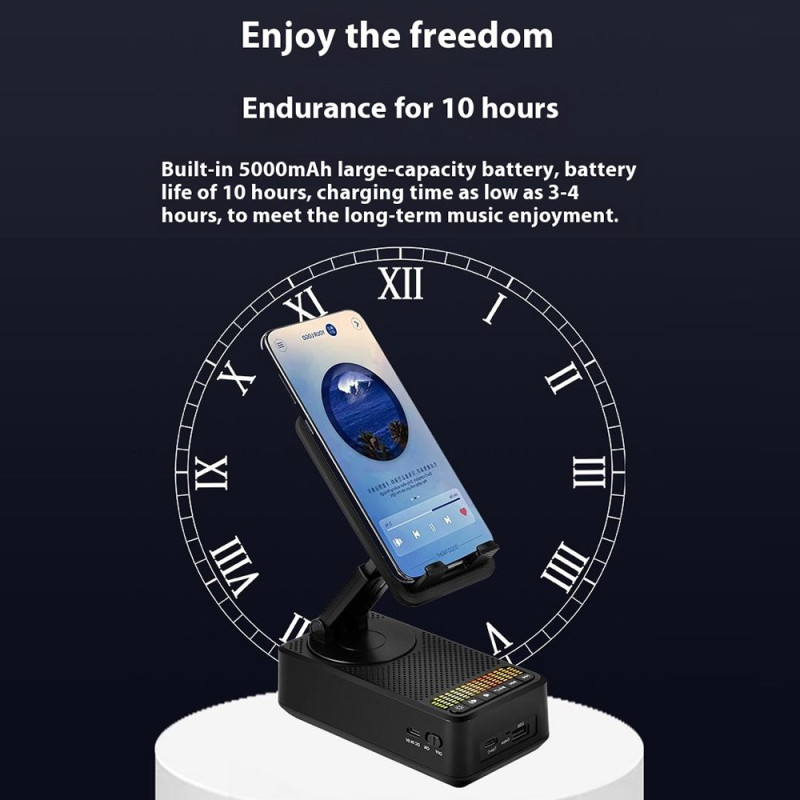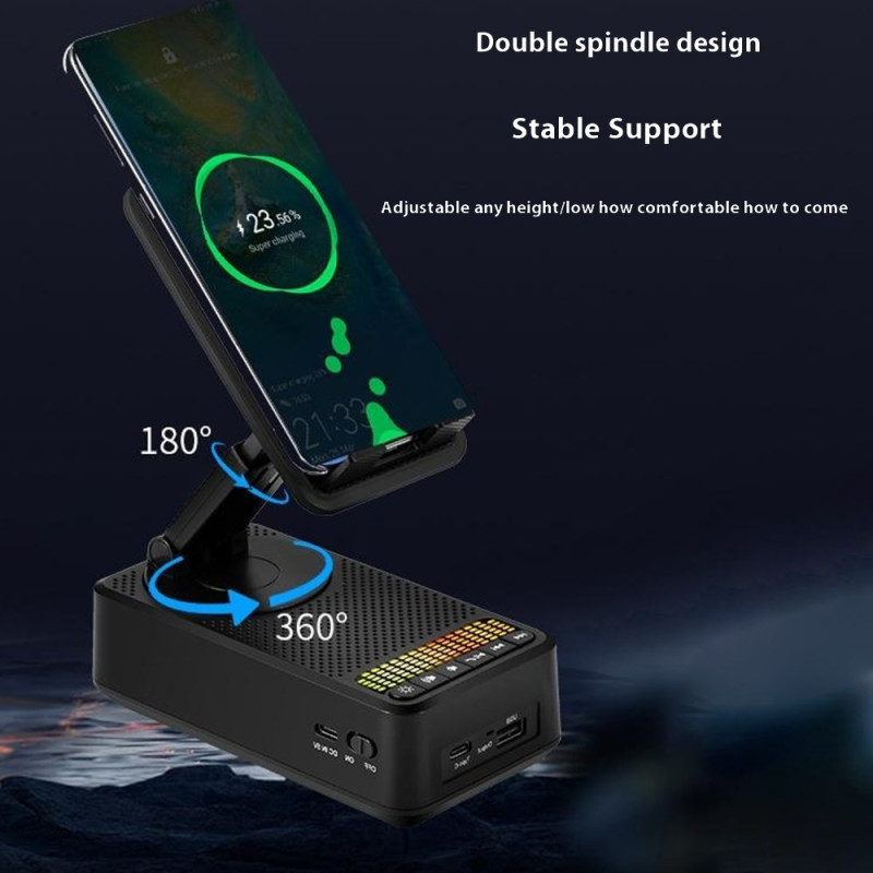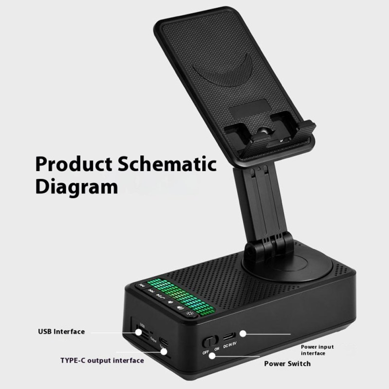 Entdecken Sie die 3-in-1-Halterung: eine um 360° verstellbare Halterung für Smartphones und Tablets, einen leistungsstarken 5W-Bluetooth-Lautsprecher und einen externen 1500mAh-Akku. Ultrakompaktes, faltbares Design mit integriertem Stimmungslicht - perfekt für zu Hause, im Büro oder unterwegs.