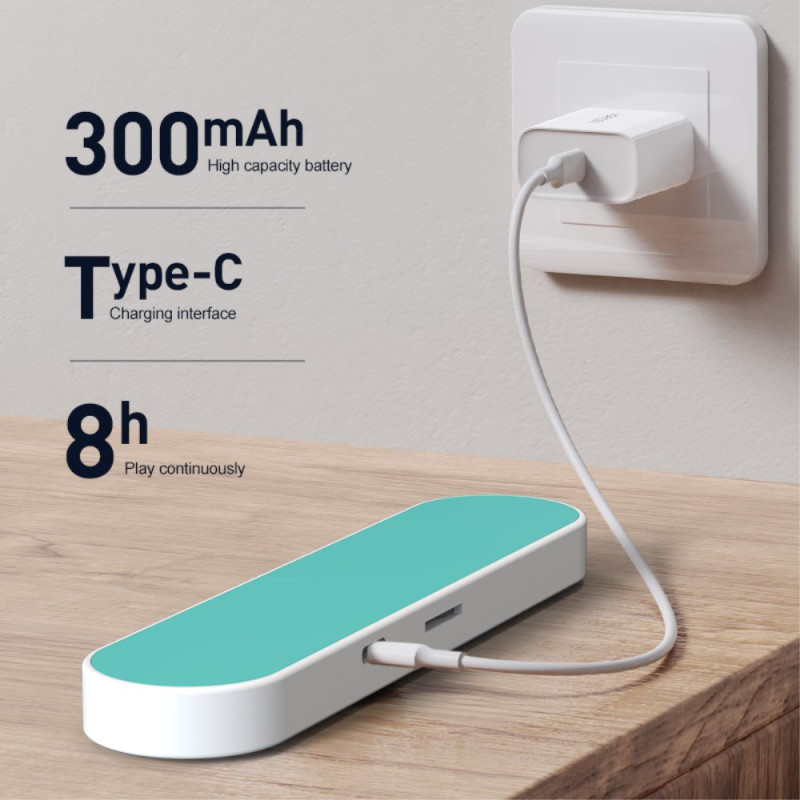 • 300mAh-Akku mit bis zu 8 Stunden Laufzeit bei nur 2 Stunden Ladezeit über den Type-C-Anschluss