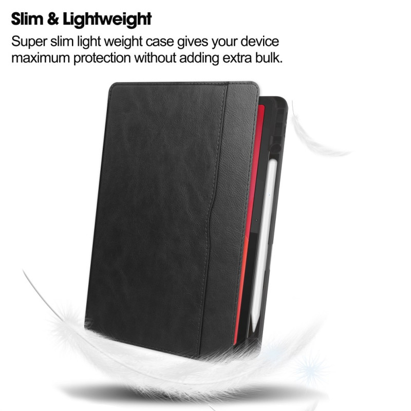 Schützen Sie Ihren Tablet-PC stilvoll mit dieser multifunktionalen Hülle aus Premium-PU-Leder. Ausgestattet mit einem praktischen Klappständer, Kartenfächern, einem Stiftfach und einer automatischen Weck-/Standby-Funktion, um den Akku zu schonen.