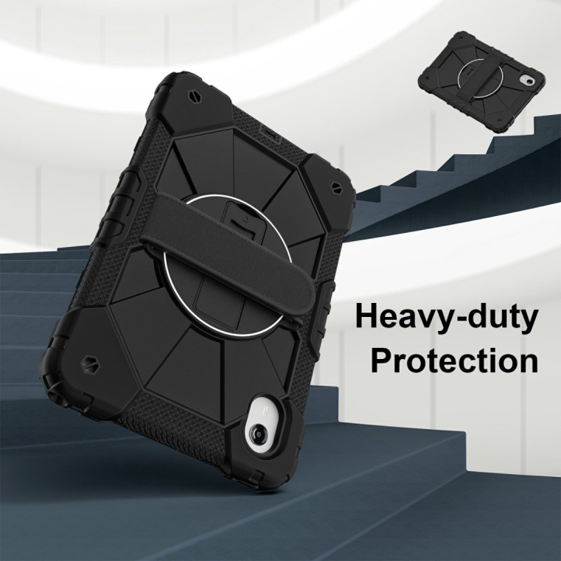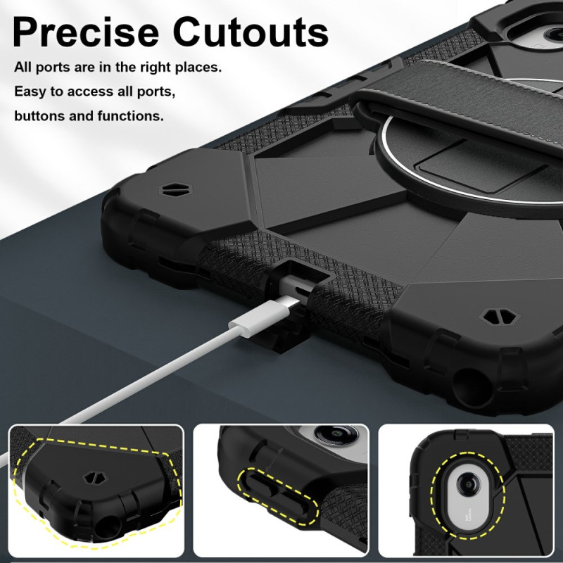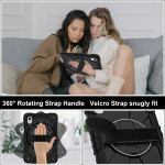 • Integrierter faltbarer Ständer für freihändiges Betrachten und um 360° drehbarer Rückenriemen zum Halten des Tablets mit einer Hand