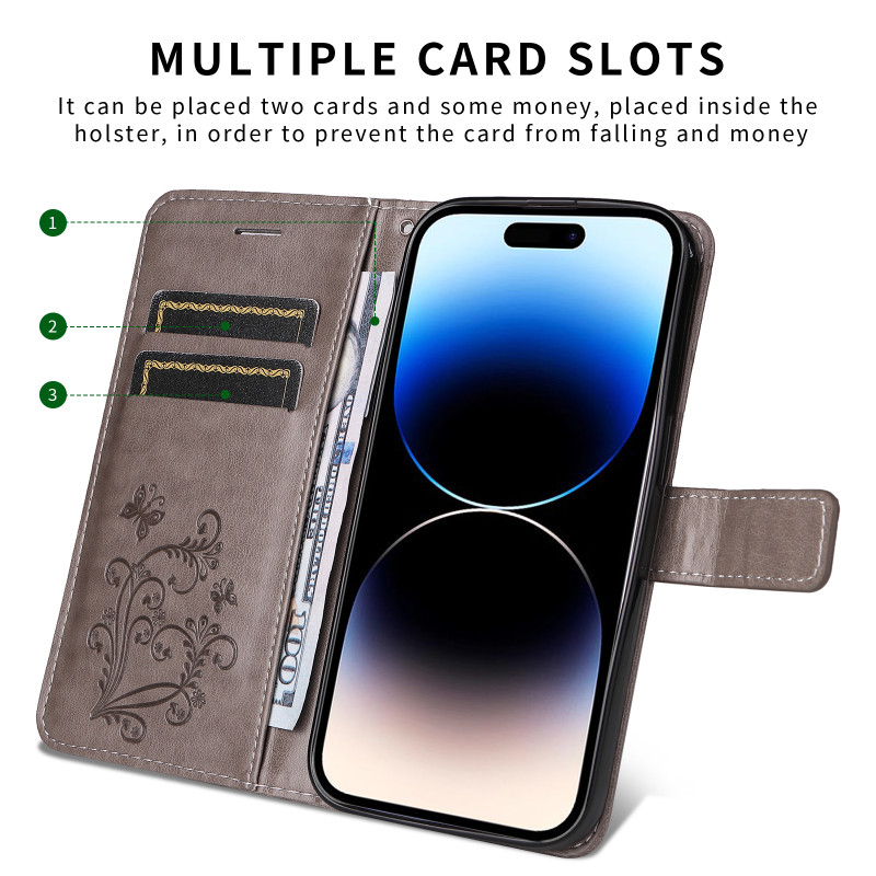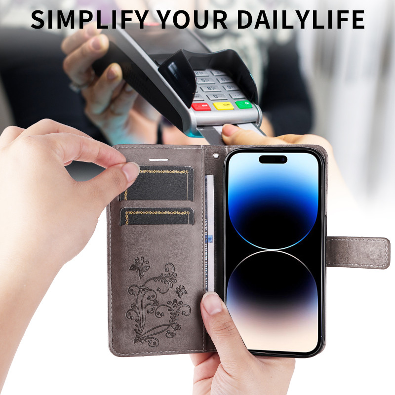 Das geprägte Schmetterlingsmuster sorgt für Relief und Stil. Die integrierten Fächer nehmen Karten und Geldscheine leicht auf.