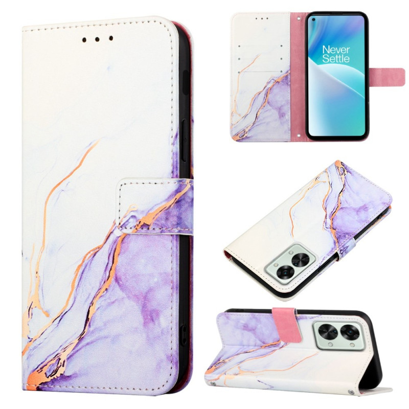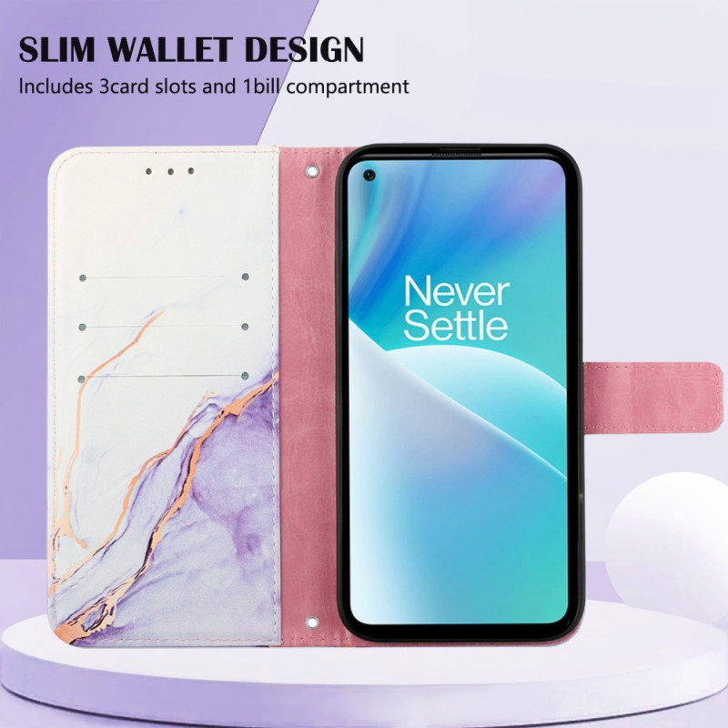 Die marmorierte Hülle mit Riemen und aus Kunstleder ist perfekt auf das OnePlus Nord 2T 5G zugeschnitten.
