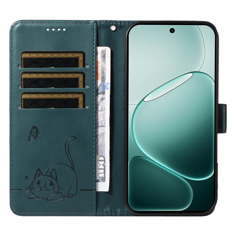 Multifunktionale Brieftasche mit eingraviertem Glückskatzenmotiv. Elegantes Design mit 3 Kartenfächern, Geldscheinfach und inkludierter Handschlaufe. Sicherer Magnetverschluss und stoßfester Rundumschutz für Ihr Smartphone.