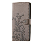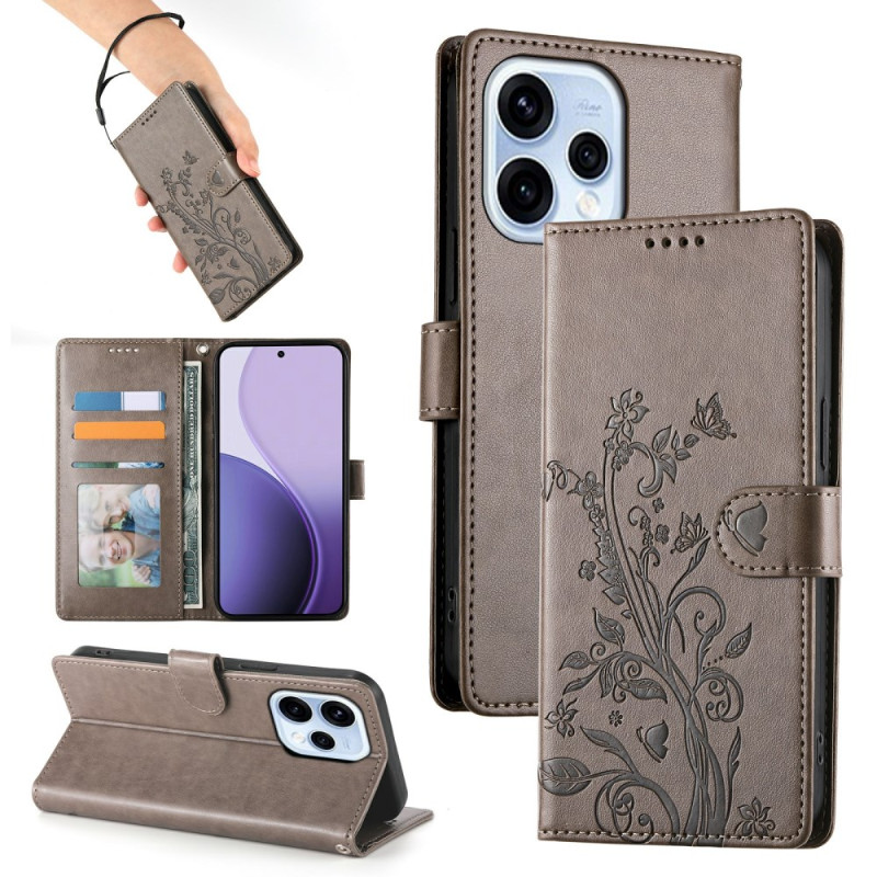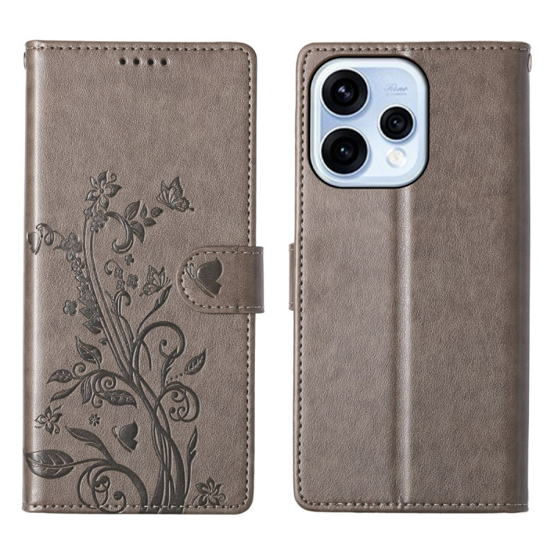 Elegante Brieftasche für das Oppo Reno 15 5G mit geprägtem Blumenschmetterlingsmuster. Dual-Material-Design aus Kunstleder und weichem TPU für optimalen Schutz. Enthält einen ausklappbaren Ständer, Kartenfächer und eine praktische Handschlaufe.