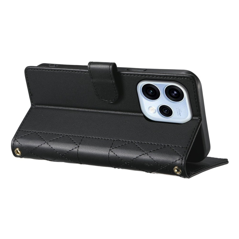 Elegante Brieftasche mit gepolstertem Rautendesign für das Oppo Reno 15 5G. Inklusive 3 Kartenfächern, 1 Bargeldfach, integrierter Standfunktion und abnehmbarem, verstellbarem Schultergurt. Umfassender Schutz vor Stößen und Kratzern.