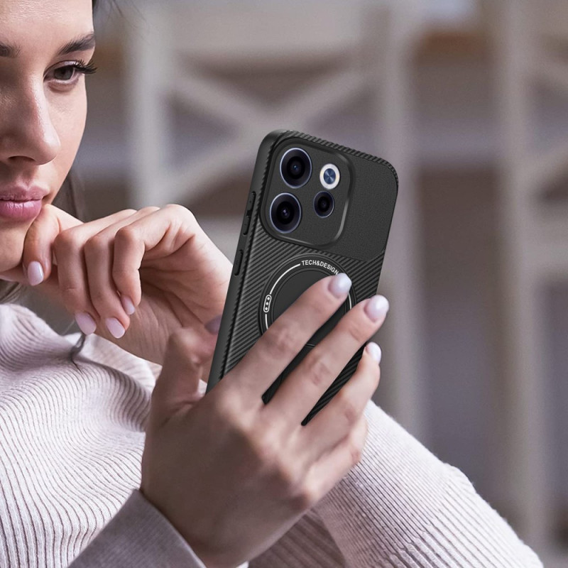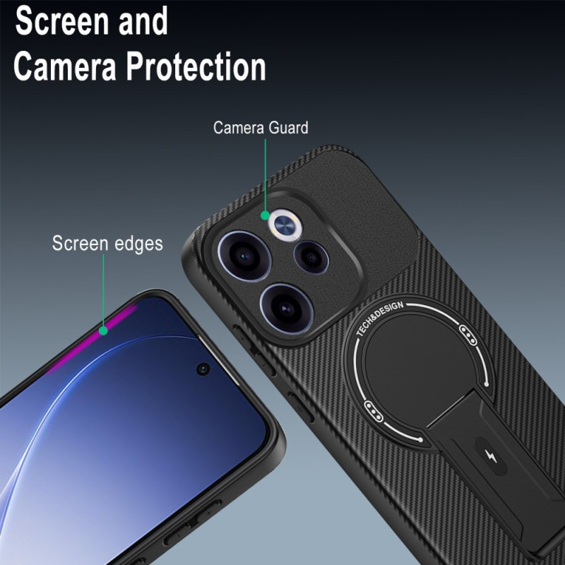 Protégez votre Oppo Reno15 F 5G avec cette coque hybride robuste. Dotée d'une texture fibre de carbone élégante, d'un support intégré rétractable et d'une technologie de dissipation thermique, elle offre une protection militaire contre les chocs tout en restant compatible avec les supports magnétiques de voiture.