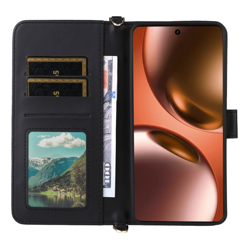 Elegante Brieftasche für Realme GT 7 5G mit verstellbarer Halterung, 6 Kartenfächern und sicherem Magnetverschluss. Kommt mit verstellbarem Schultergurt und abnehmbarer Handschlaufe für den vielseitigen Transport im Alltag.