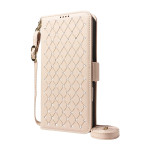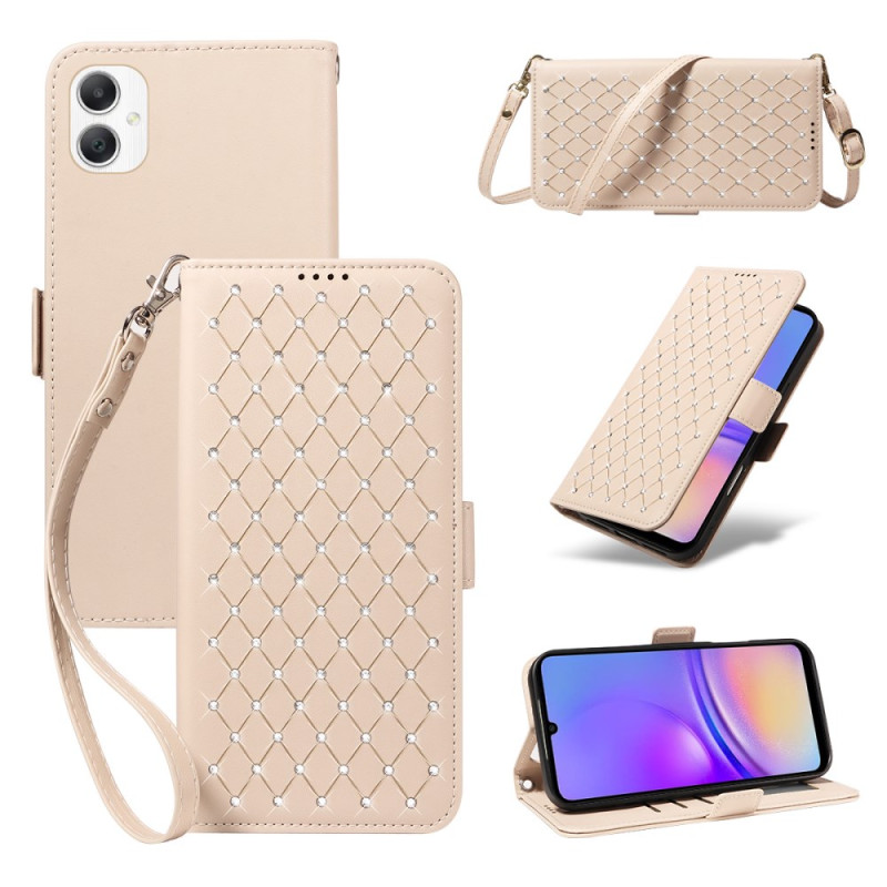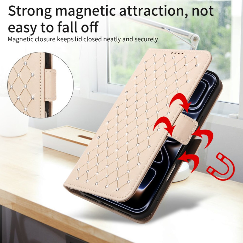 Entdecken Sie diese elegante Brieftaschenhülle mit Klappe, die mit Strasssteinen und einem raffinierten Rautenmuster verziert ist. Mit seinen drei Kartenfächern, dem RFID-Schutz und der integrierten Halterung vereint es Stil und Alltagstauglichkeit.