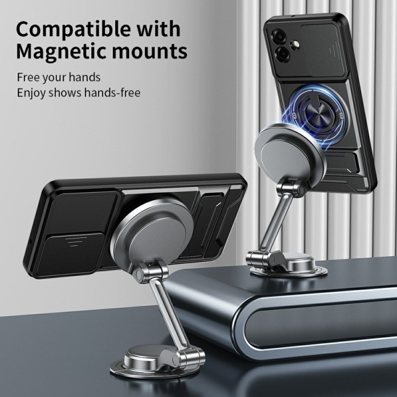 Schützen Sie Ihr Samsung Galaxy A07 5G / 4G mit dieser innovativen magnetischen Schutzhülle. Mit einem um 360° drehbaren Stützring, einer faltbaren Halterung für freihändiges Betrachten und einem verschiebbaren Kameraschutz vereint sie Funktionalität und optimale Sicherheit.