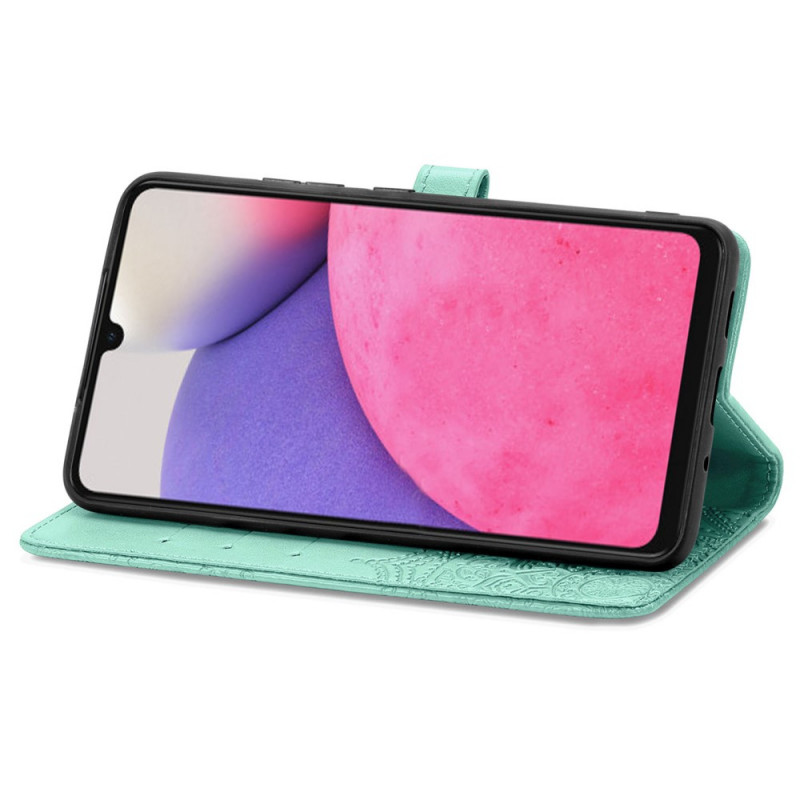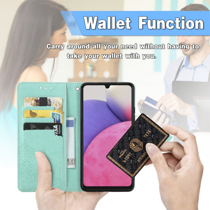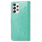 Eine wunderschöne Hülle für das Samsung Galaxy A13, die mit einem mittelalterlichen Mandala verziert ist, es vollständig sichert und gleichzeitig als Brieftasche dient.