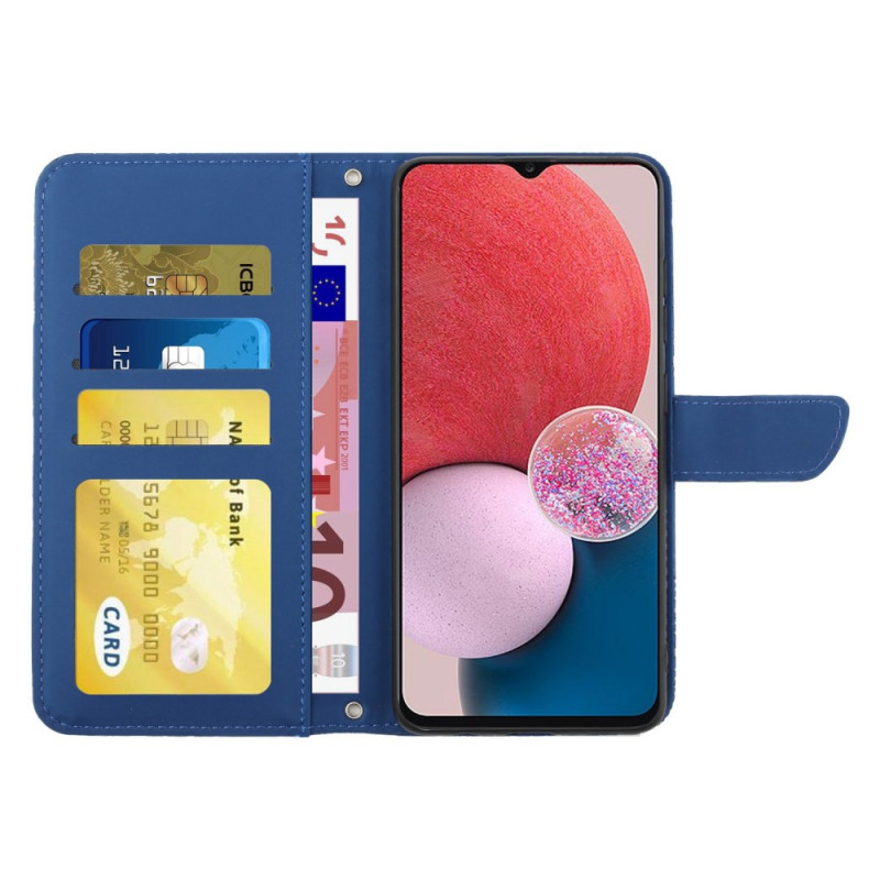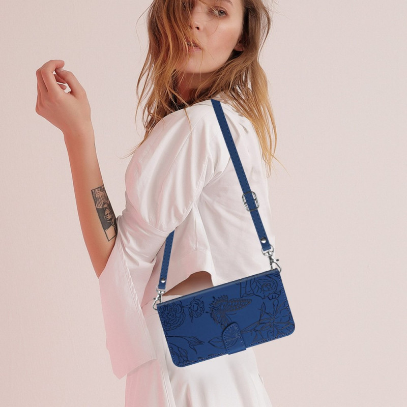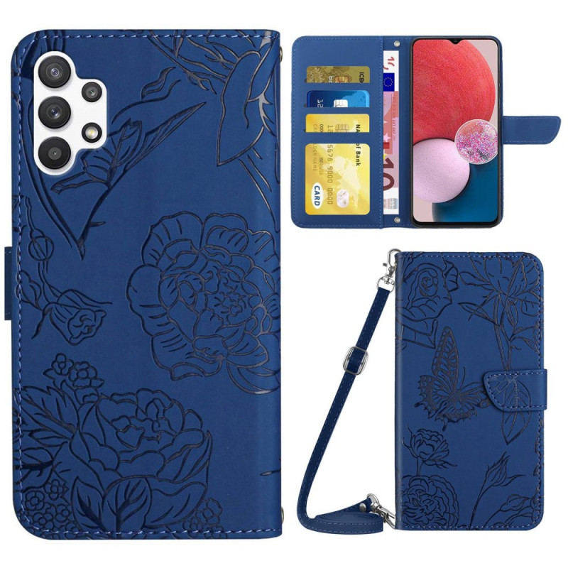 Die Kunstlederhülle Schmetterlinge kommt mit einem verstellbaren Schultergurt, um das Samsung Galaxy A13 zu transportieren.