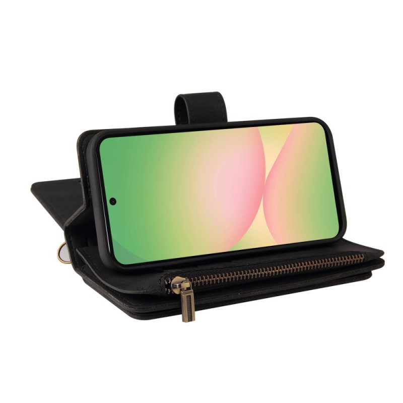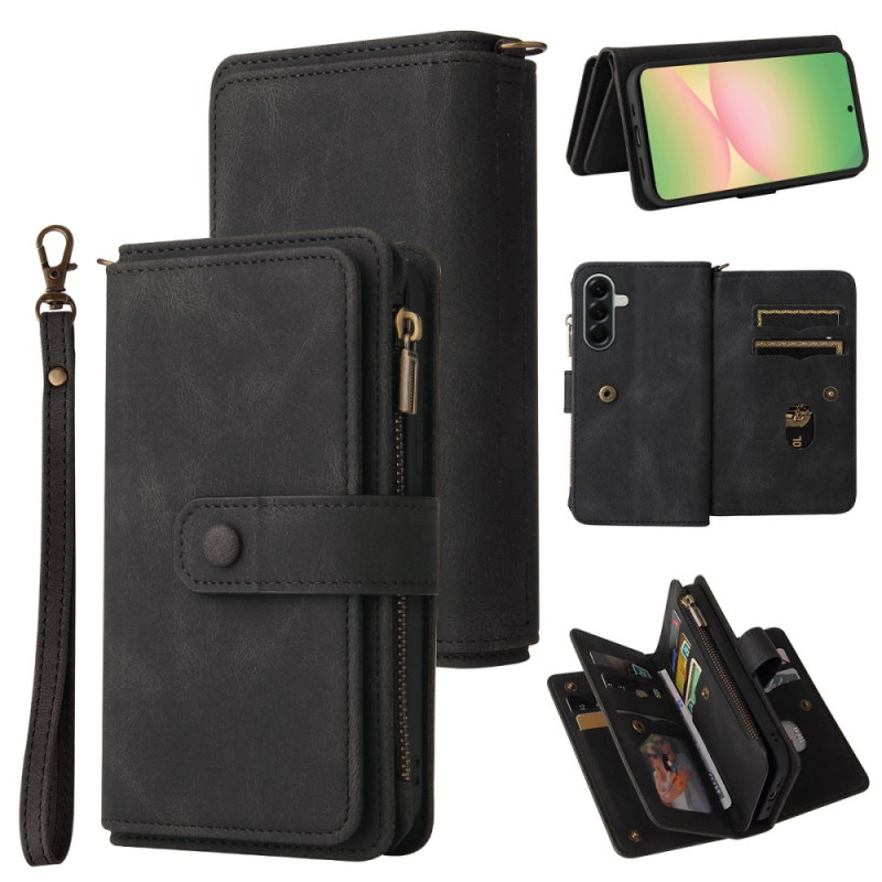 Schützen Sie Ihr Samsung Galaxy A57 5G stilvoll mit dieser multifunktionalen Brieftasche. Mit 15 Kartenfächern, einem sicheren Reißverschlussfach und einer abnehmbaren Handschlaufe vereint sie Eleganz und Alltagstauglichkeit.