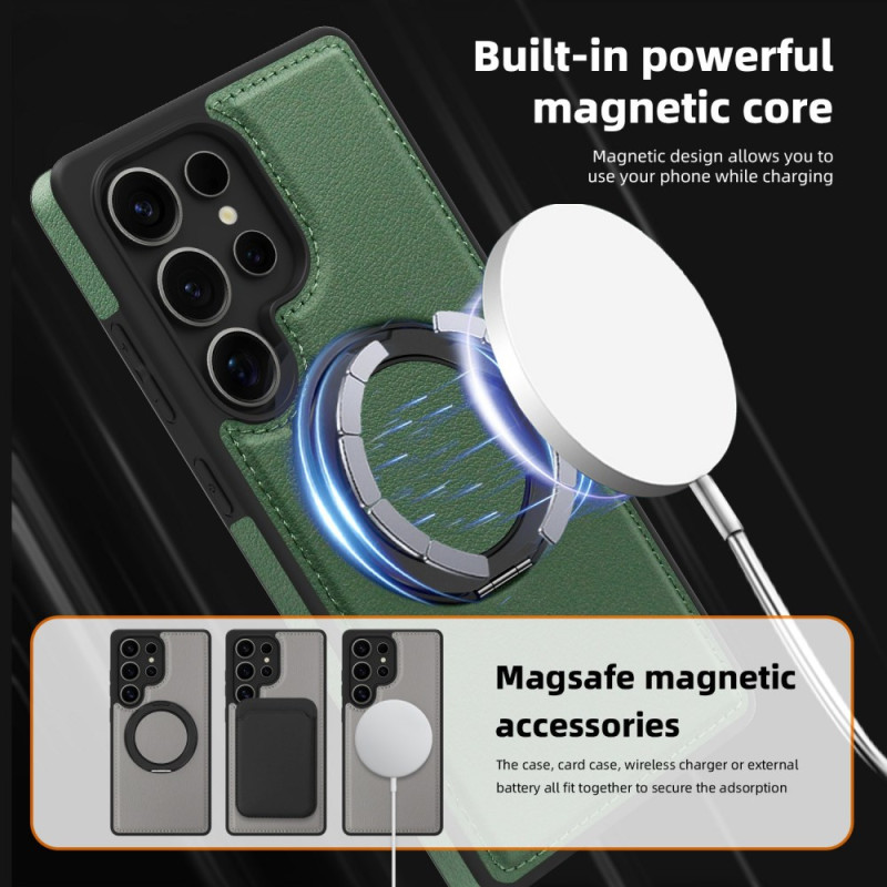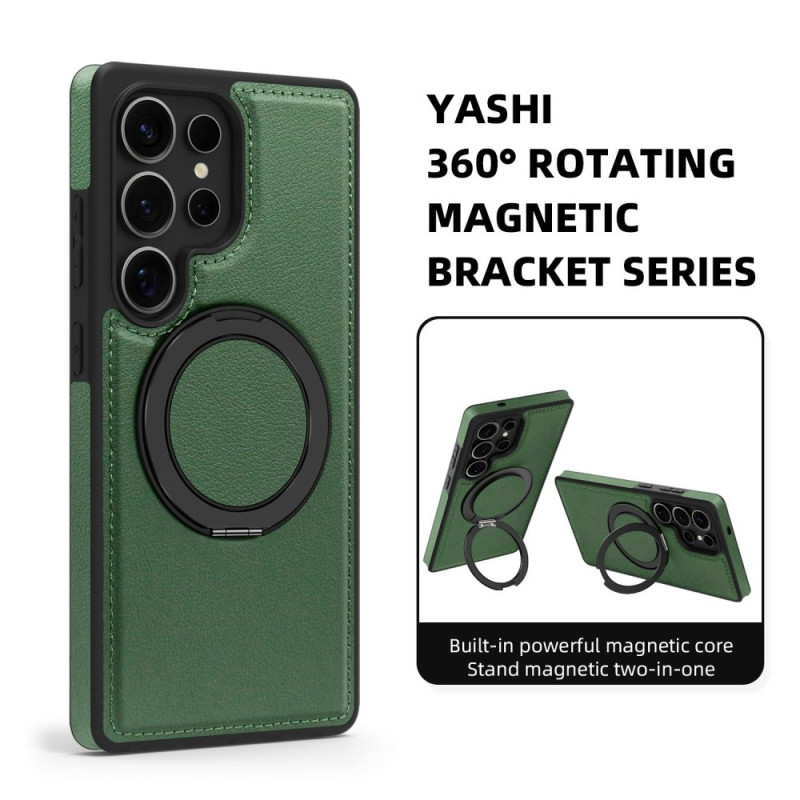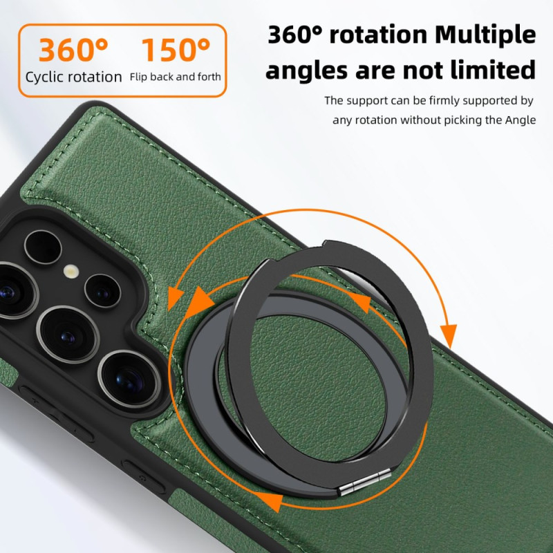 Entdecken Sie unsere innovative magnetische Hülle für das Samsung Galaxy S25 Ultra. Sie verfügt über einen um 360° drehbaren Ring und bietet dank ihrer Kombination aus TPU, PC und PU-Leder einen robusten Schutz.